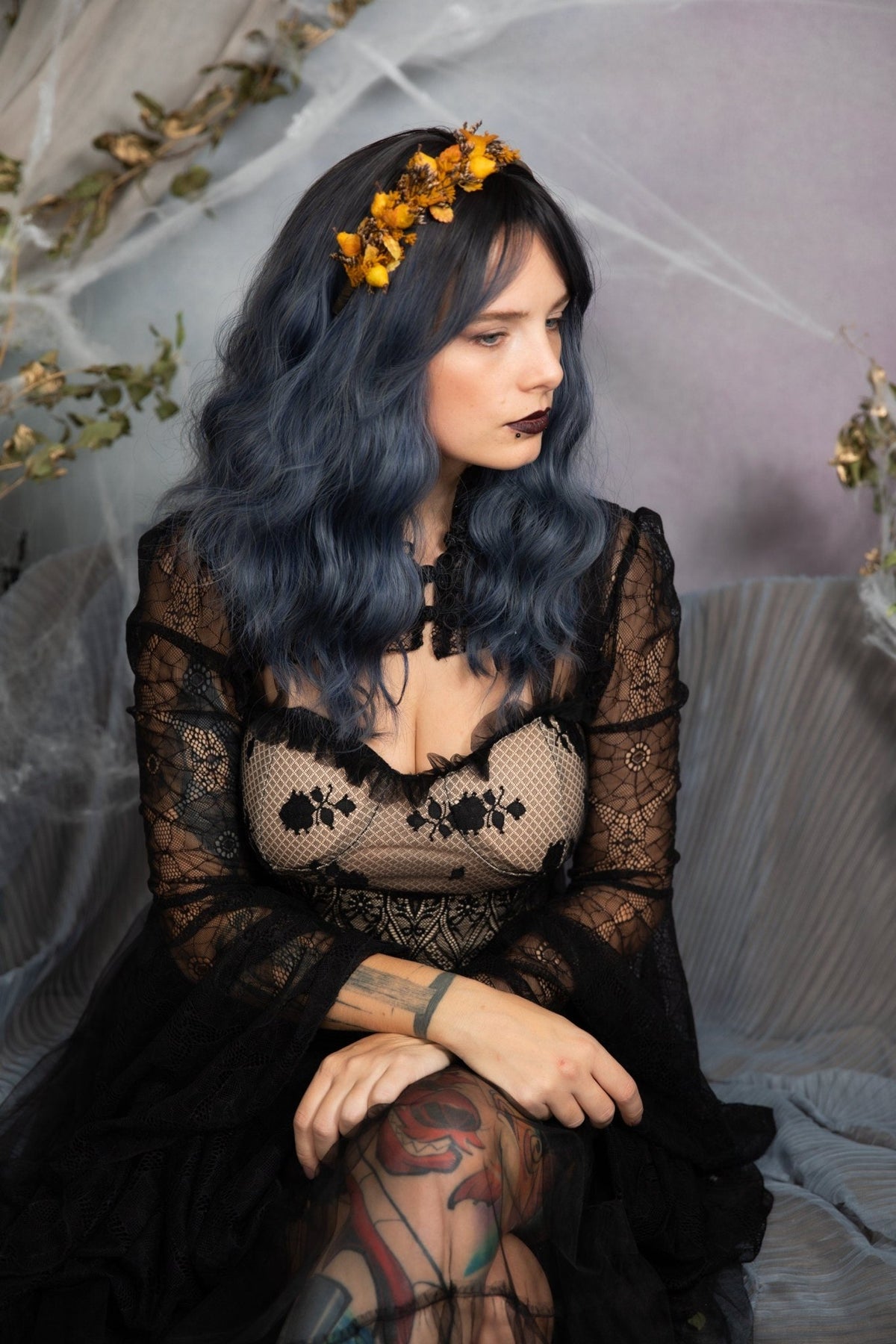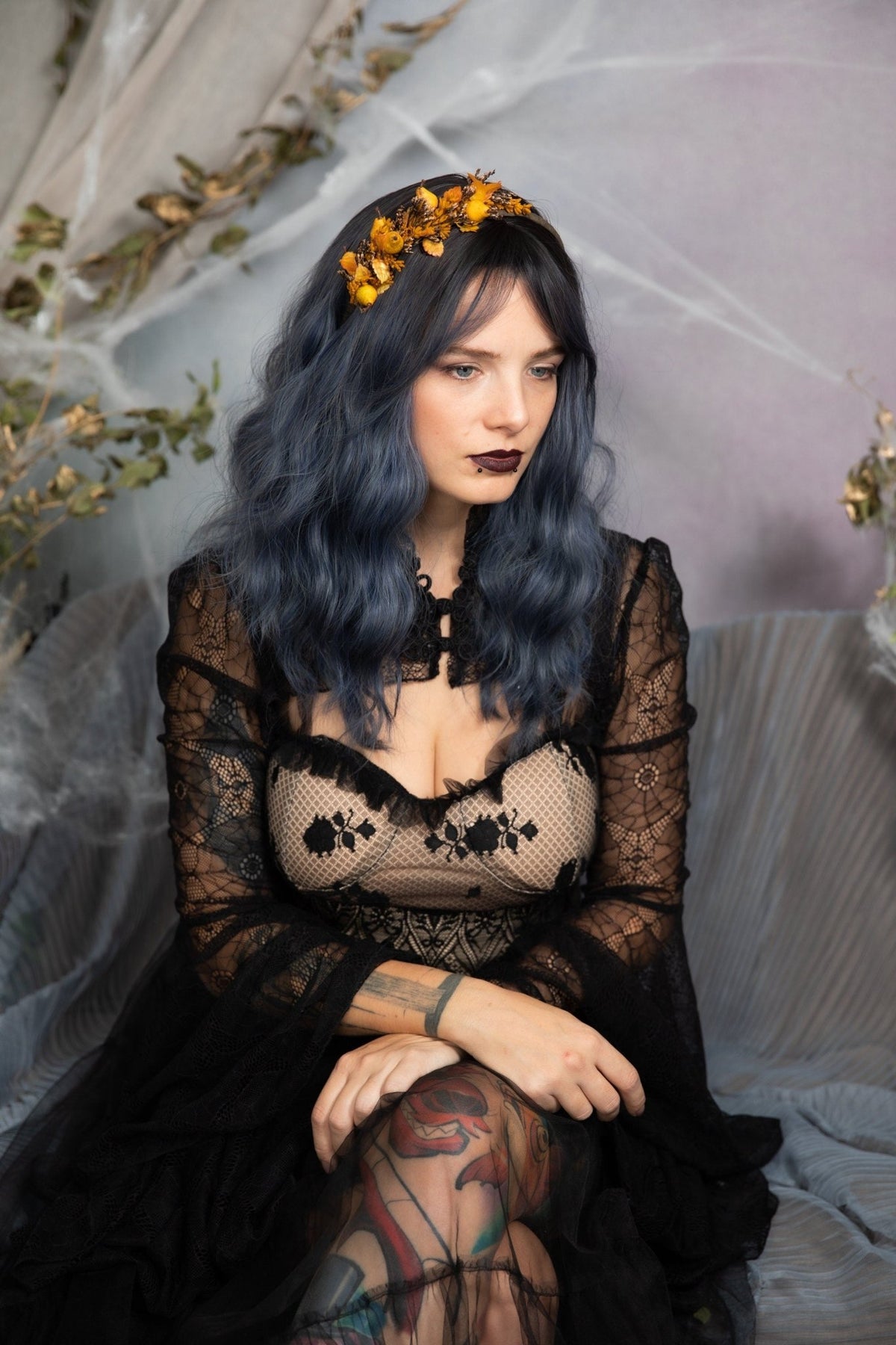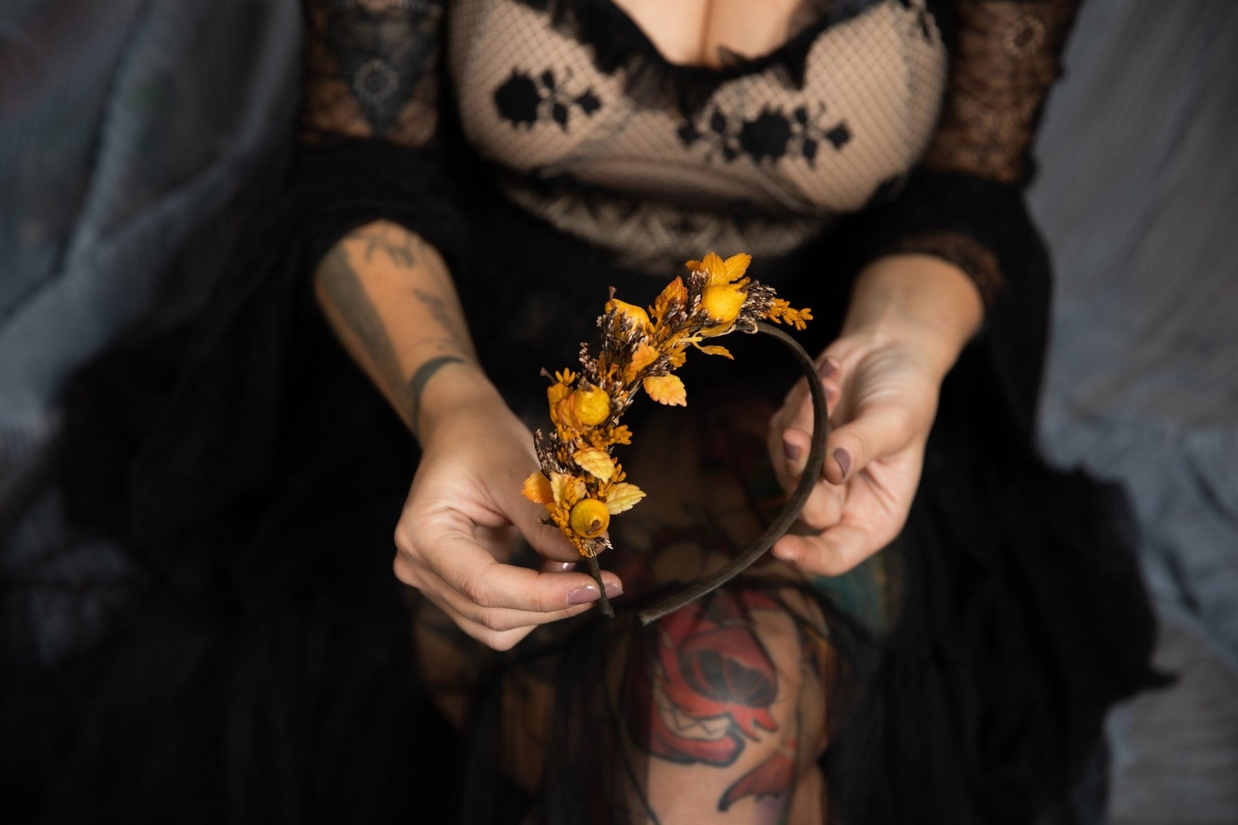 The flower headband is made of preserved and artificial flowers, grass, pears, and other arranging material.