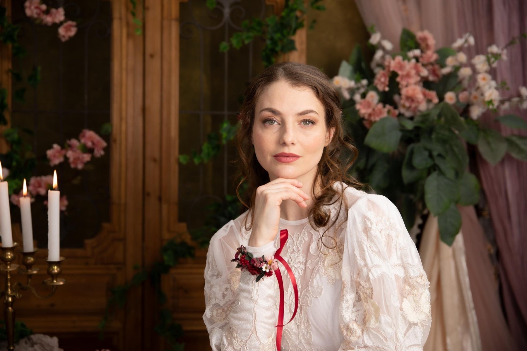 Burgundy Floral Wrist Corsage, Bridal Flower Bracelet – handmade floral hair accessory by magaela