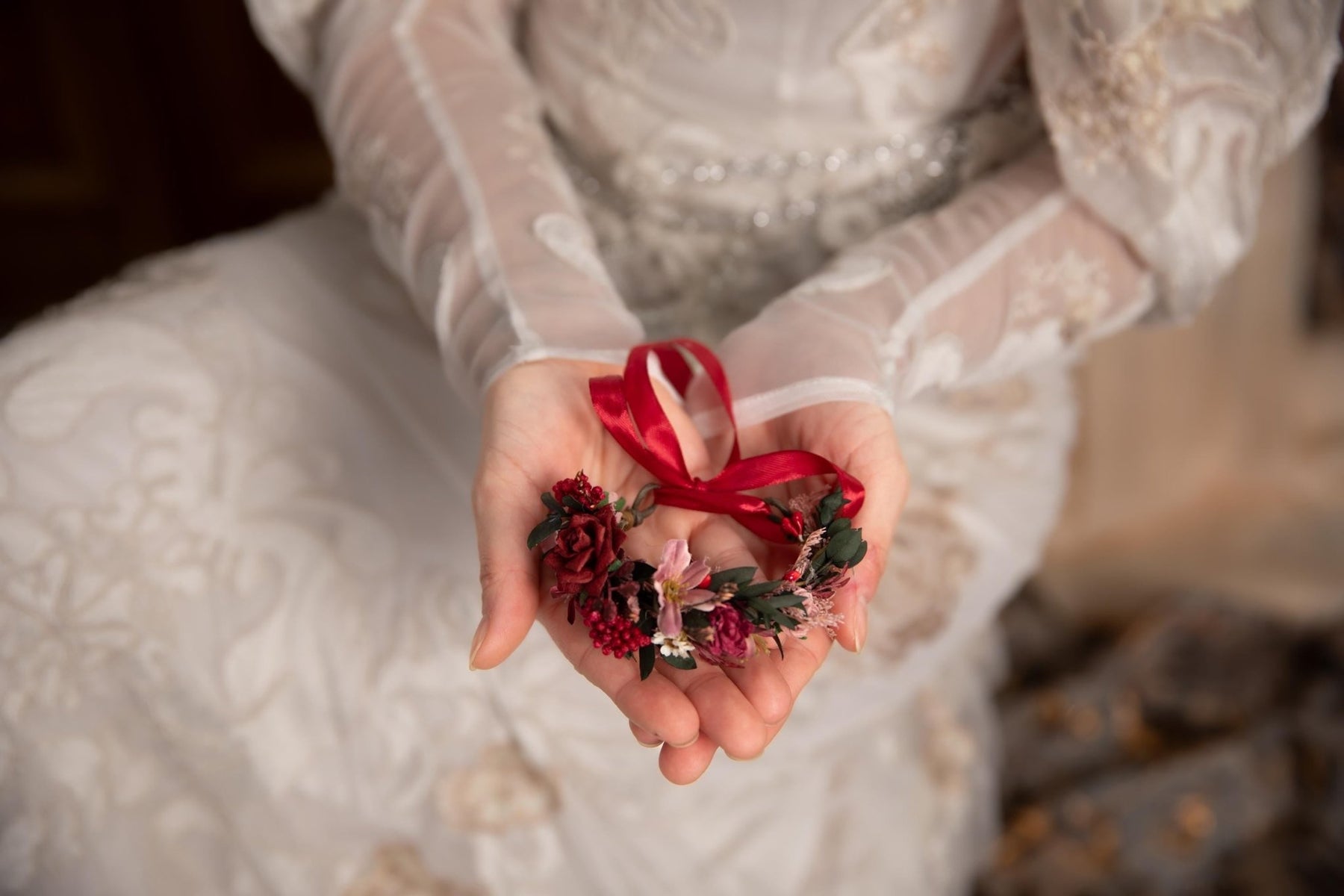 The flower bracelet is made of artificial and preserved flowers and other trinkets used for arranging.