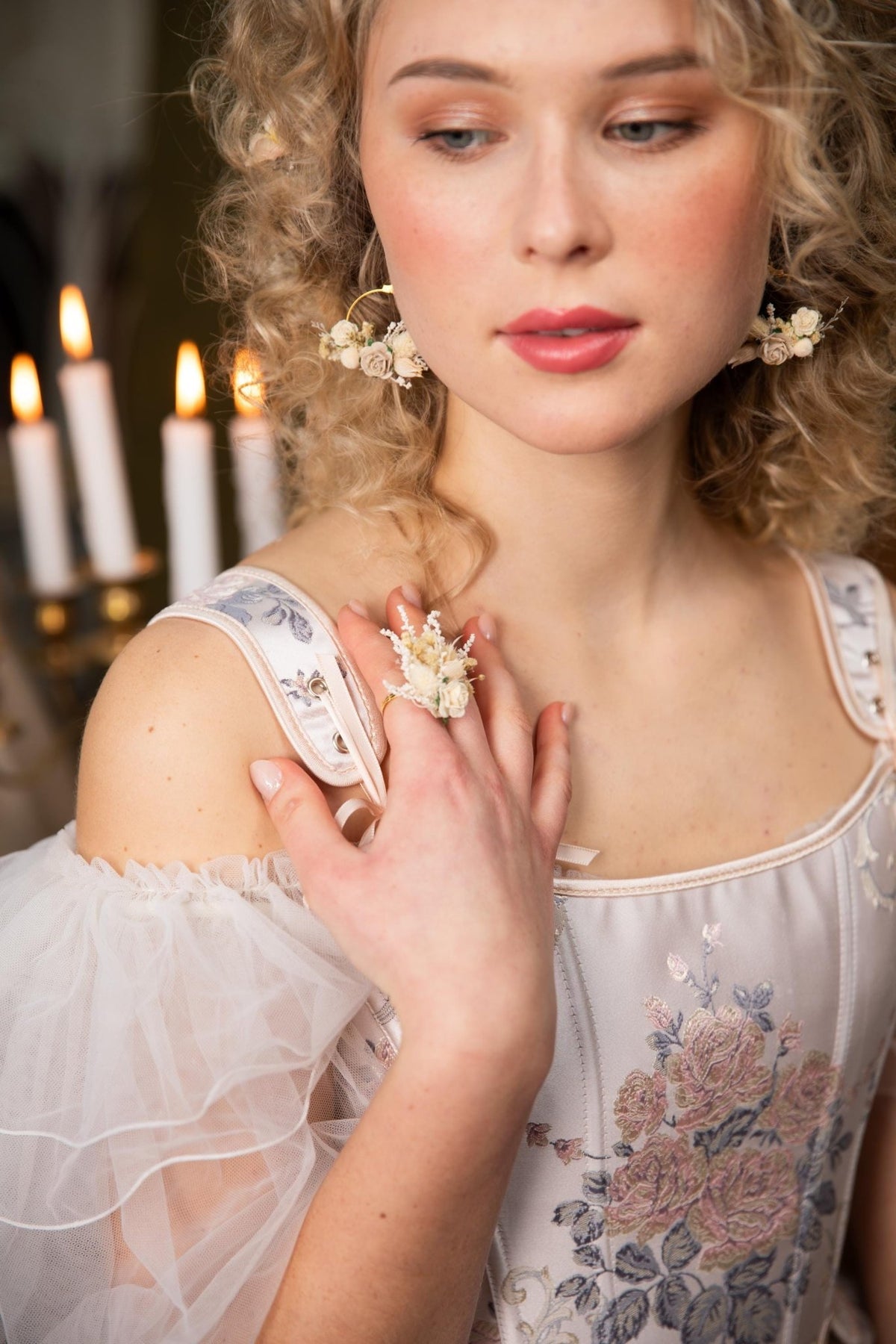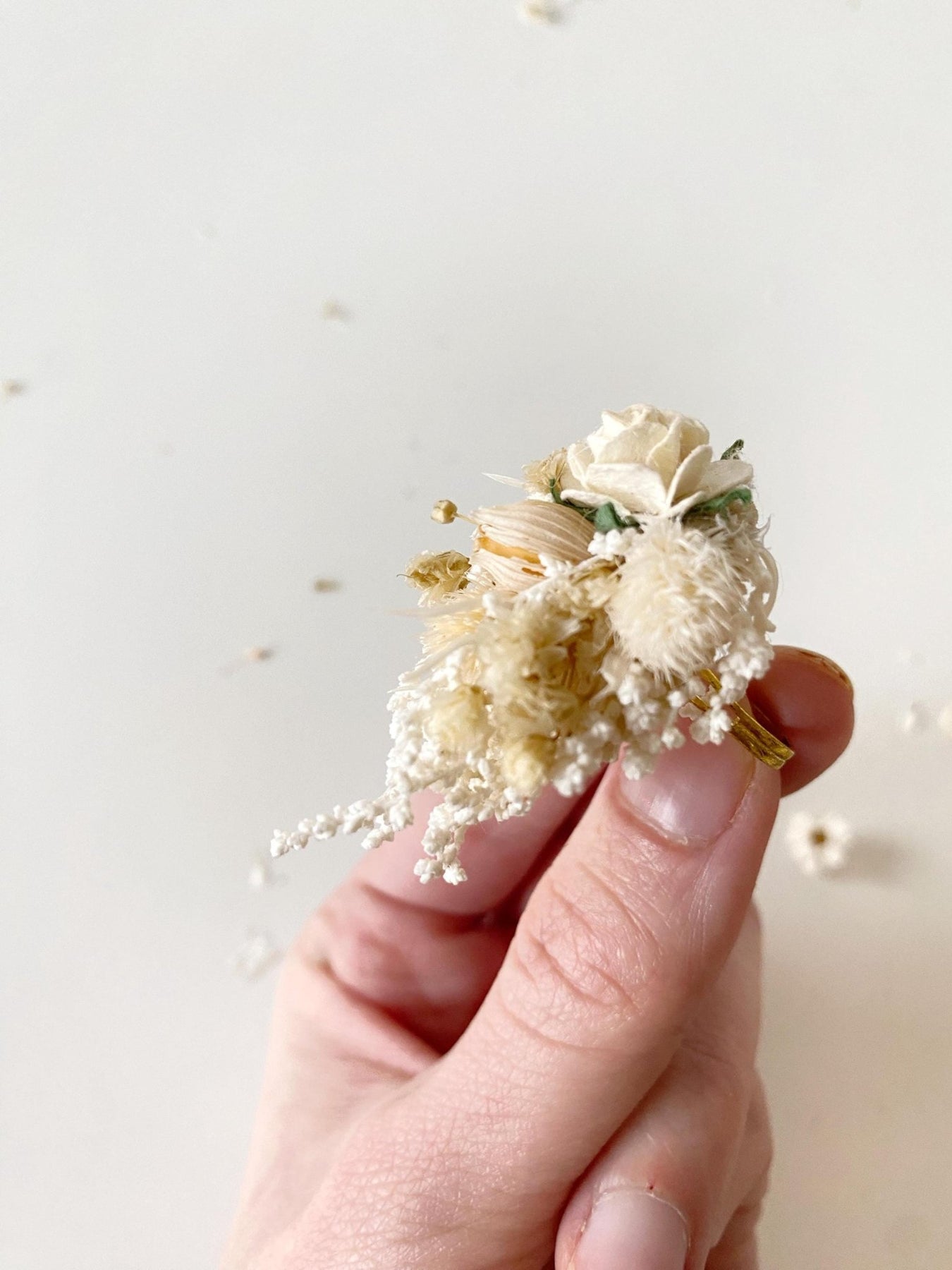 Perfect for weddings, photoshoots, parties, other events or everyday look. Nice gift for bridesmaids or friends. Made of artificial, dried and preserved material and other material used for arranging.