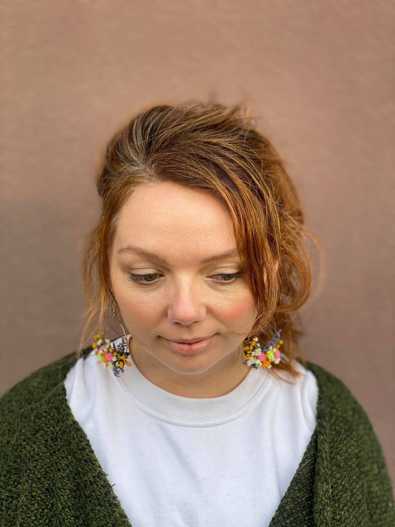 The earrings are made of preserved flowers, leaves and grass, wire, and other trinkets used for arranging :)