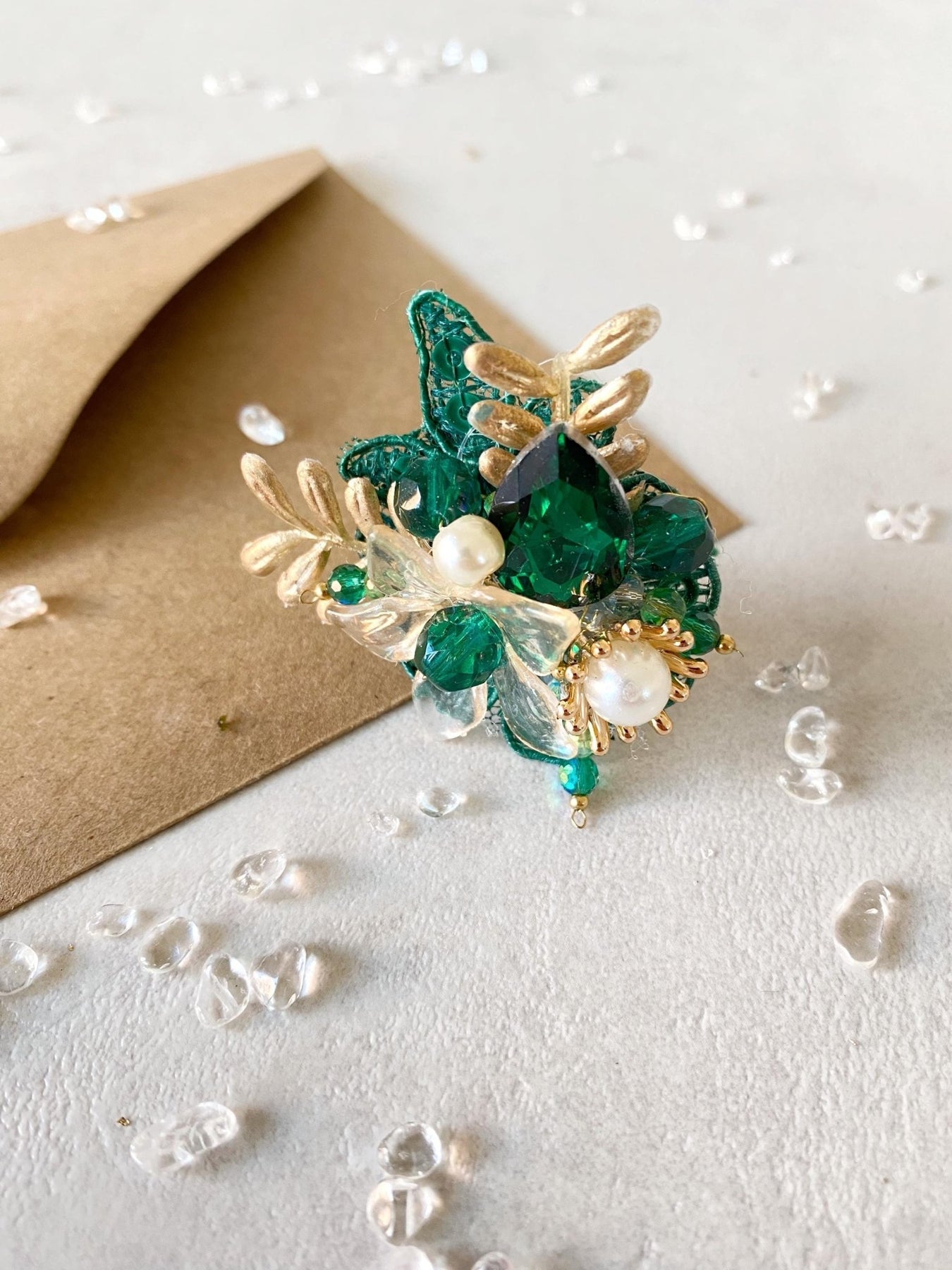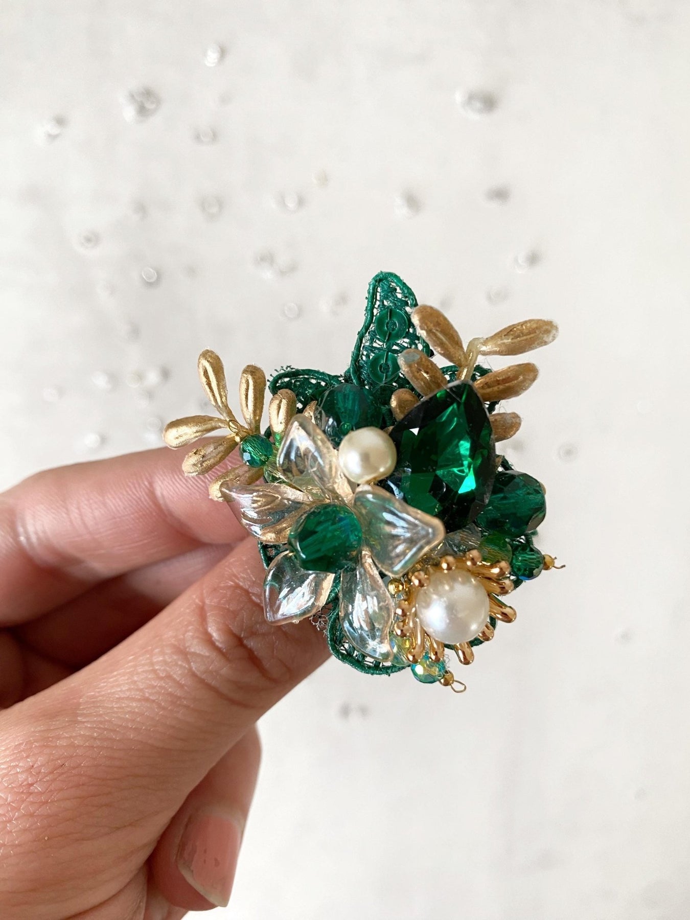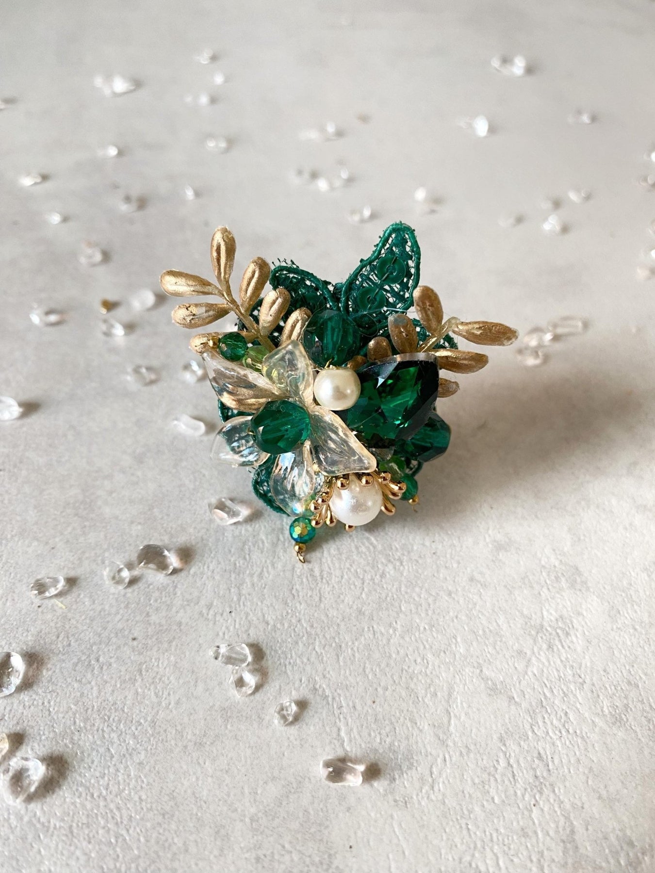 Glam Emerald Green Flower Ring: Bridal Gold Floral Jewelry – handmade floral hair accessory by magaela
