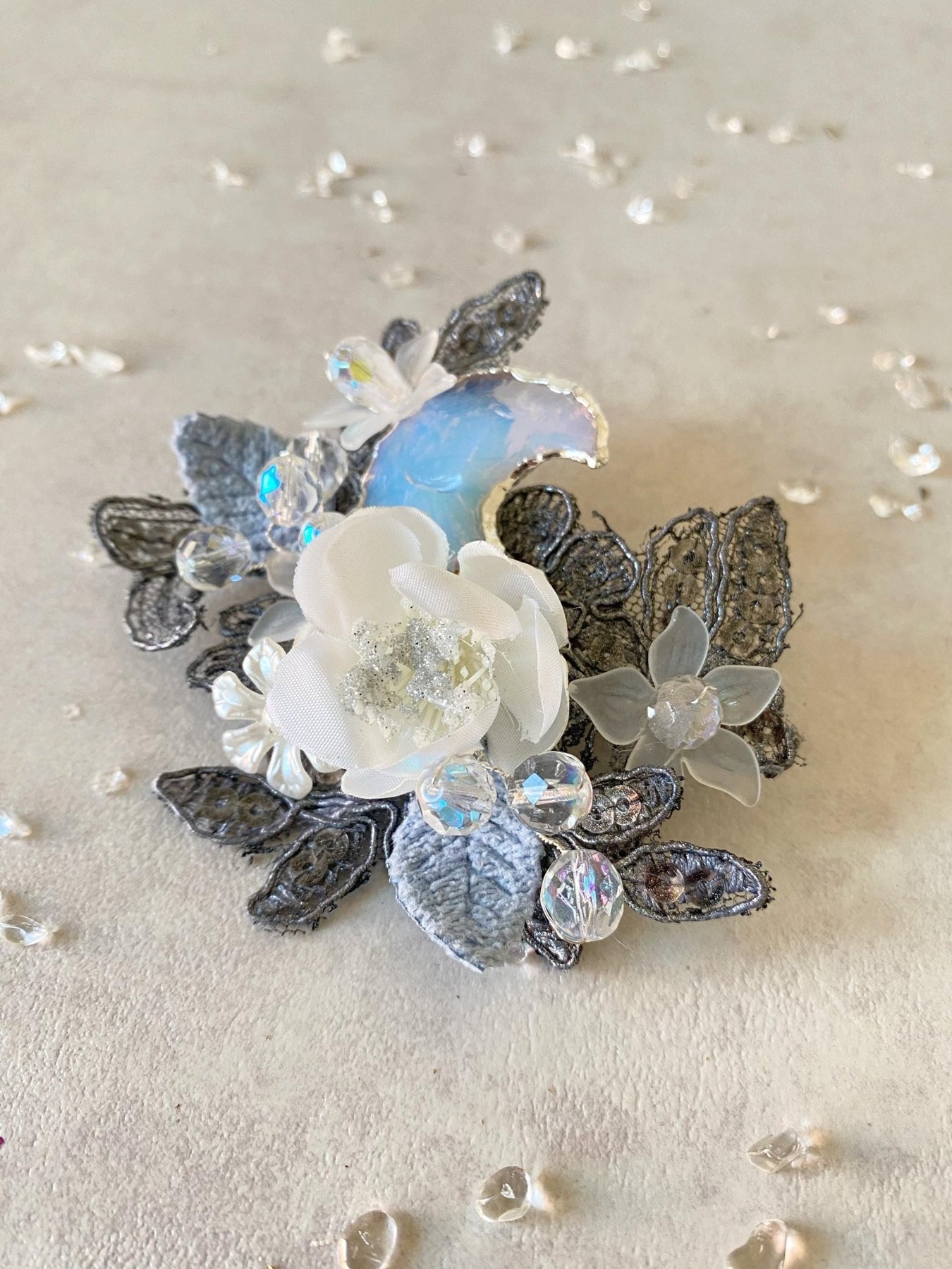The flower brooch is made of artificial flowers, leaves, moon, beads, lace and other trinkets used for arranging.