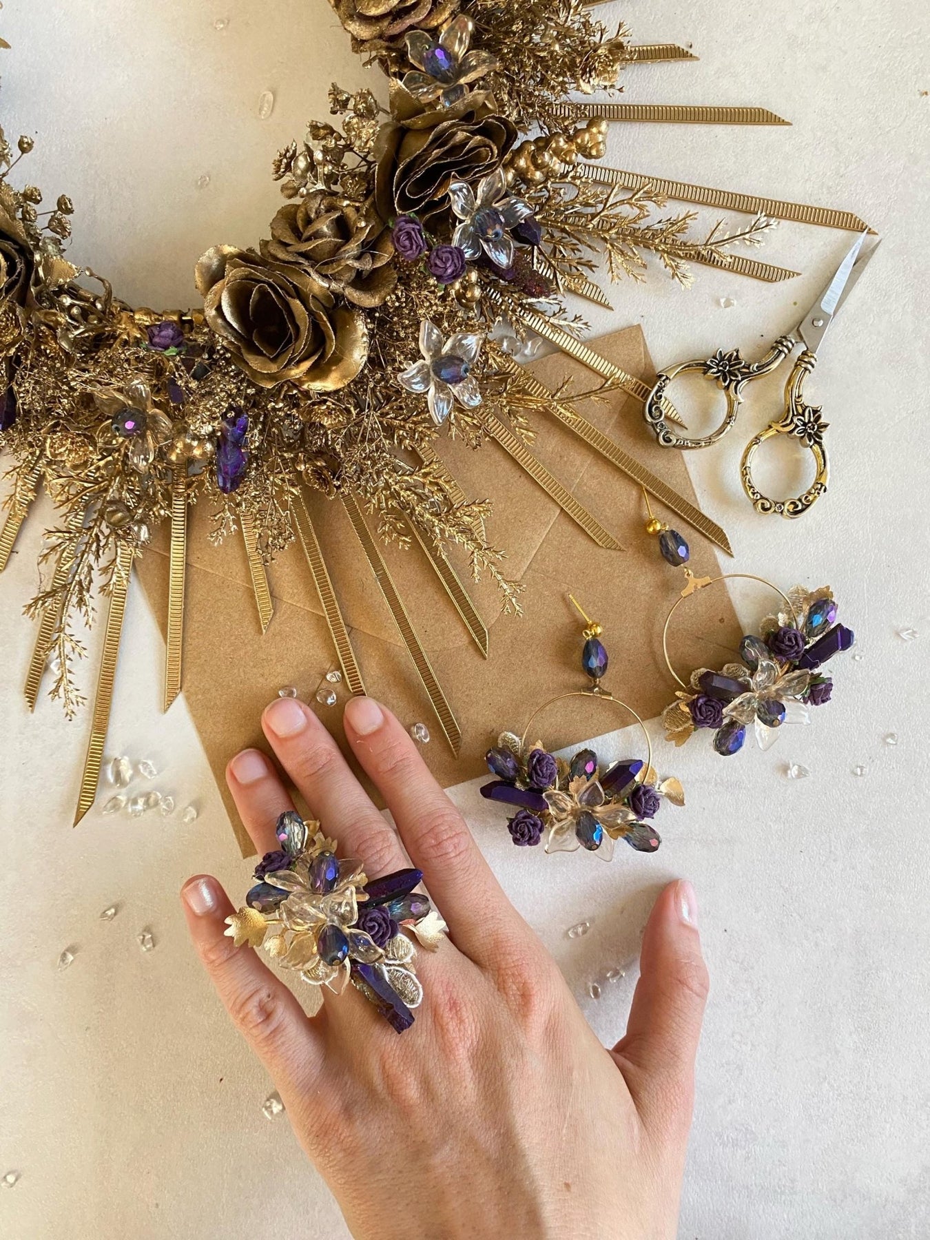 Gold & Purple Halo Crown: Crystal Bead Spiked Sun Ray Crown – handmade floral hair accessory by magaela