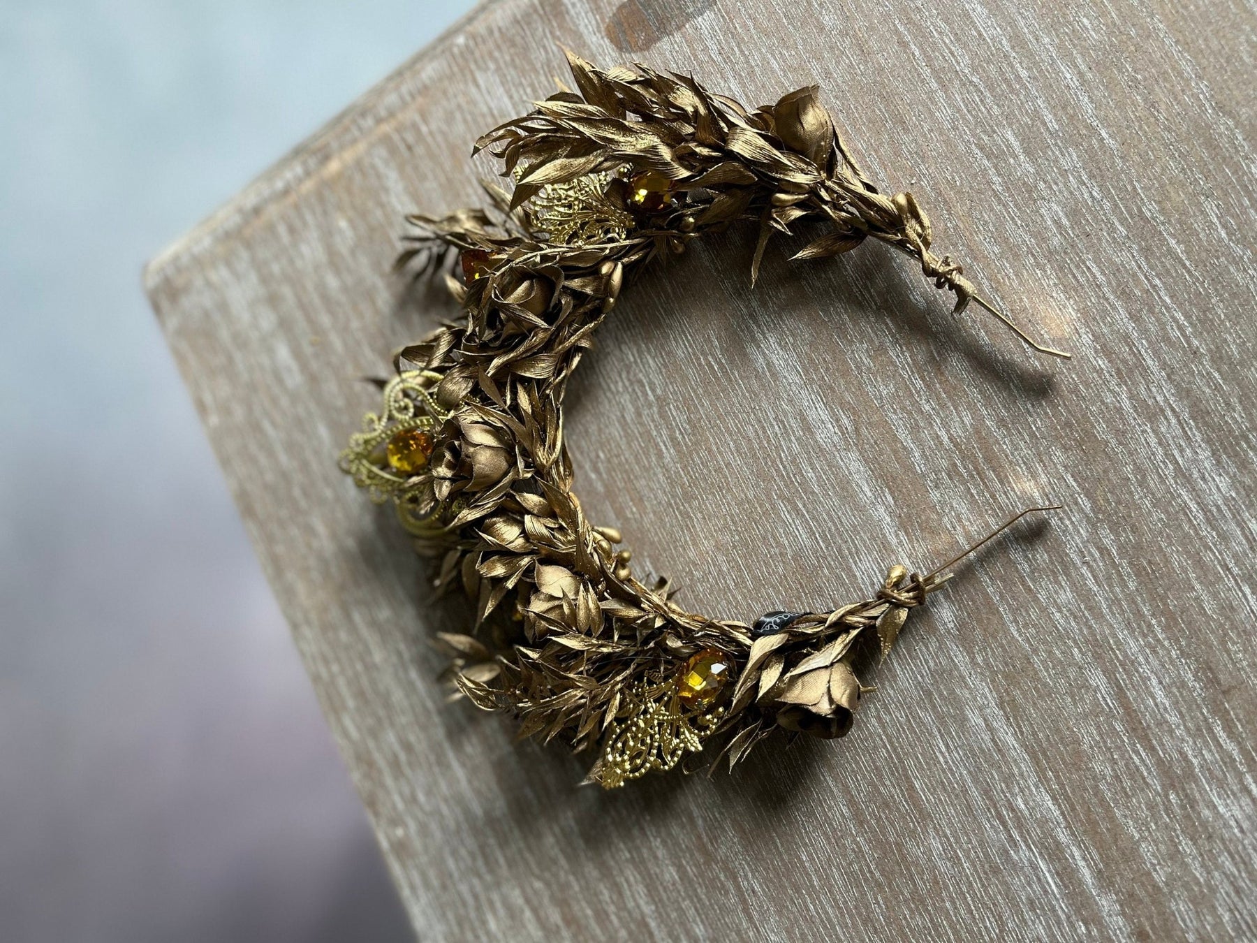 The flower crown is made of leaves, crystals, flowers and other trinkets used for arranging.