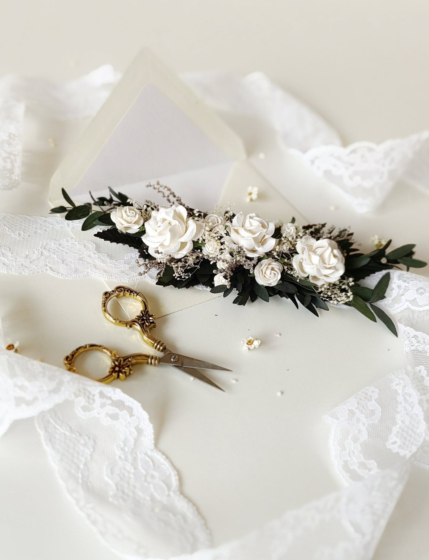 Matching hair comb: https://www.etsy.com/uk/listing/1025763960/romantic-greenery-hair-comb-bridal?click_key=9f72ae7391e389c61f19535288964e3c16b6aa6f%3A1025763960&click_sum=1086ddd6&ga_search_query=white%2Bcomb&ref=shop_items_search_2&pro=1&sts=1