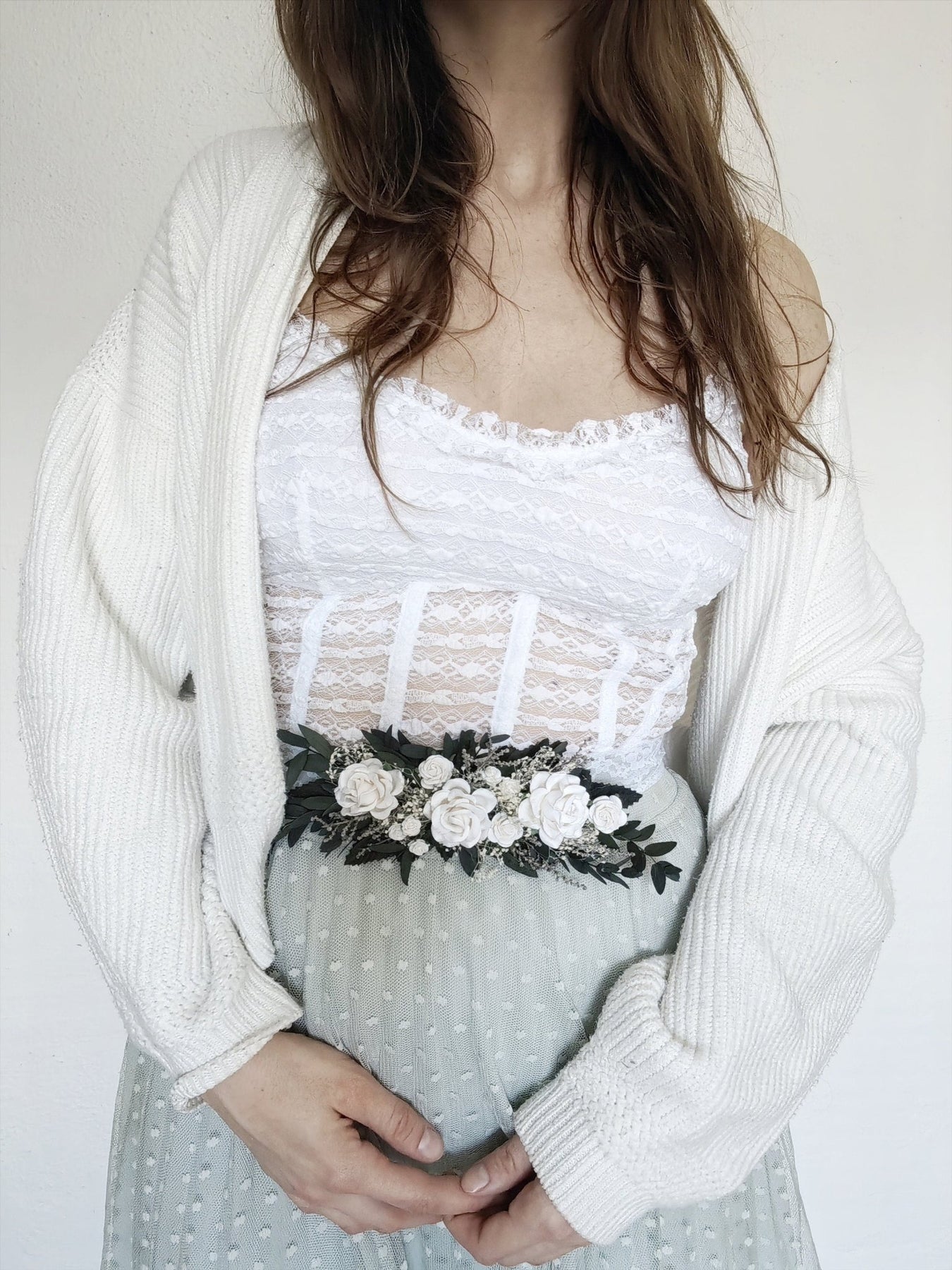 Greenery Bridal Belt: White Roses & Eucalyptus Floral Belt – handmade floral hair accessory by magaela