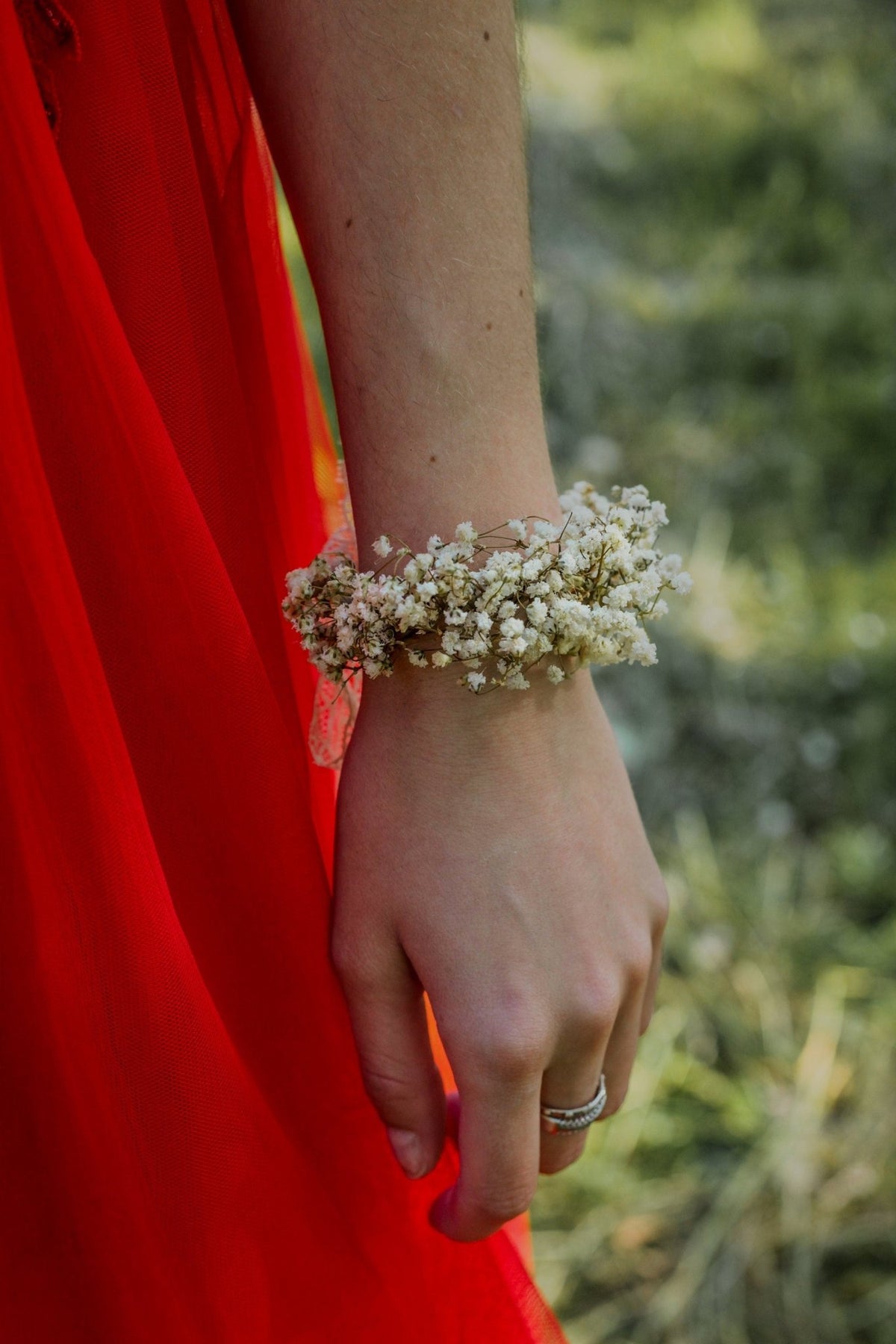 The flower bracelet is made of preserved baby's breath flowers and other trinkets used for arranging.