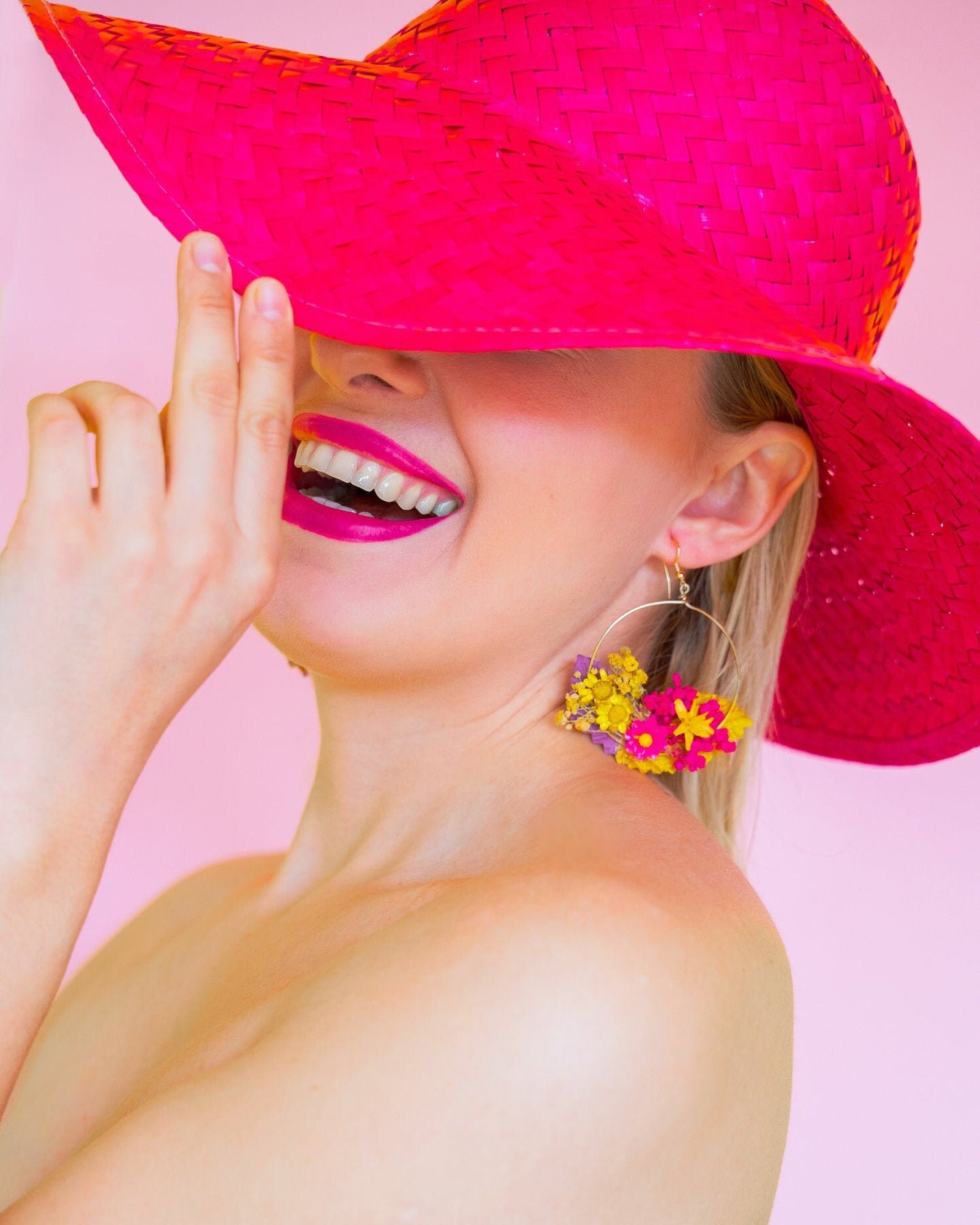 Wedding flower circle dangle earrings in magenta and yellow colours. Flowers/colours can be customised.
