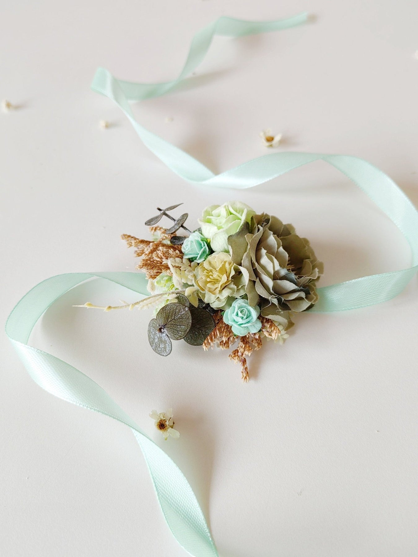 Mint Green Flower Bracelet: Boho Wedding Wrist Corsage – handmade floral hair accessory by magaela