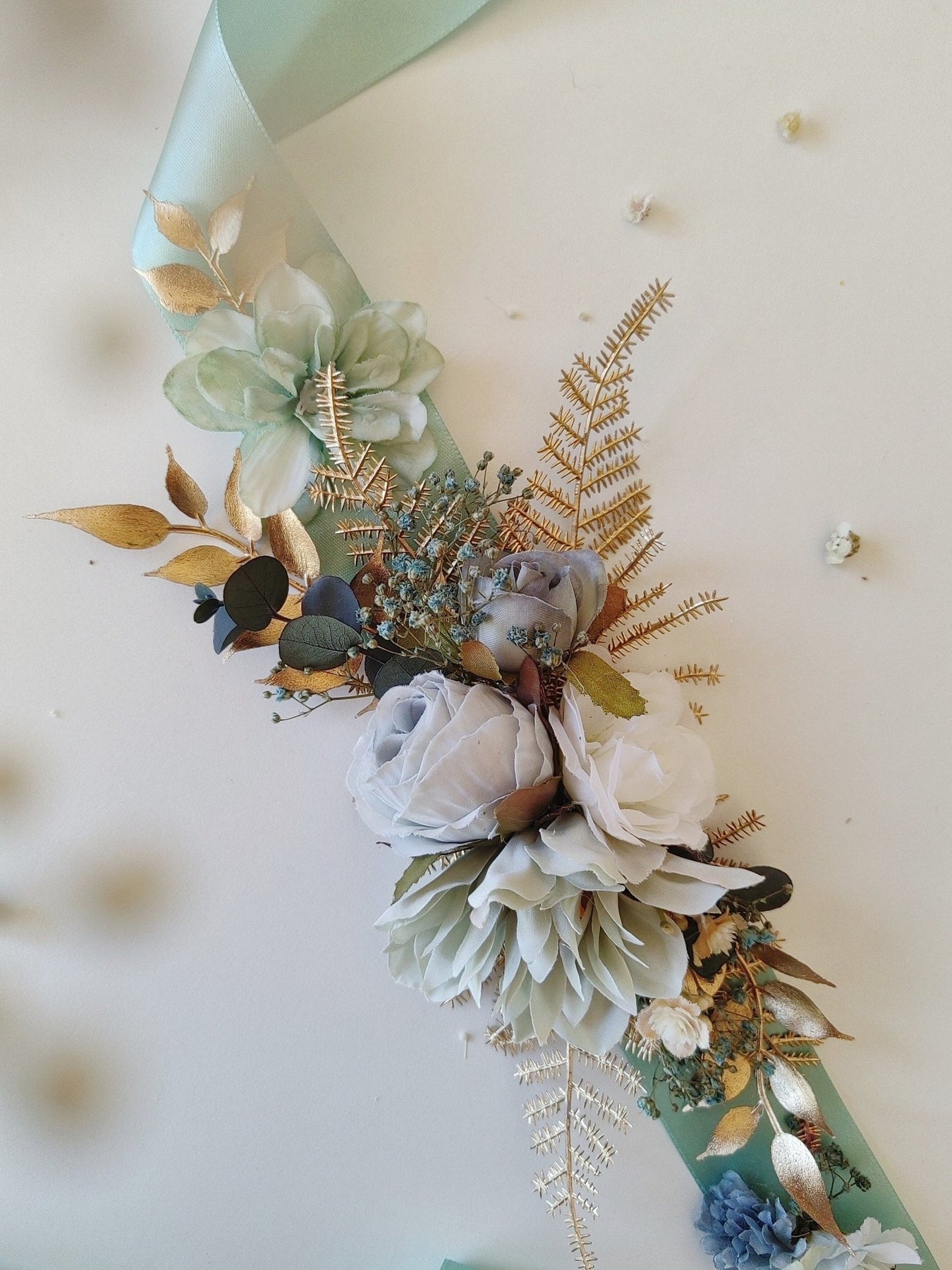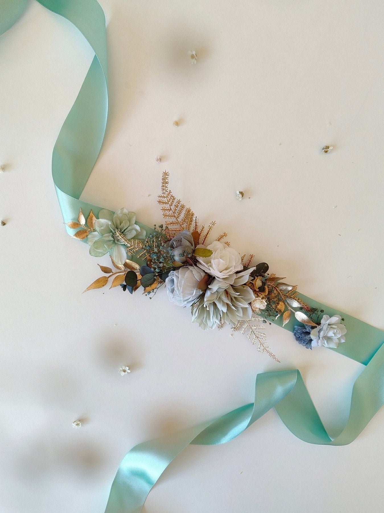 Bridal flower belt in mint and gold tones. Boho design.