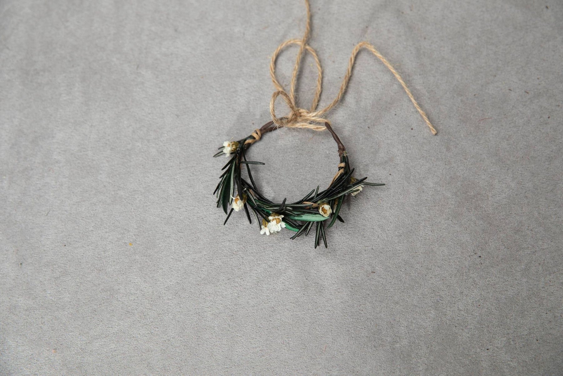 The bracelet is made of olive leaves, rosemary, preserved/dried flowers, wire and other trinkets used for arranging :)