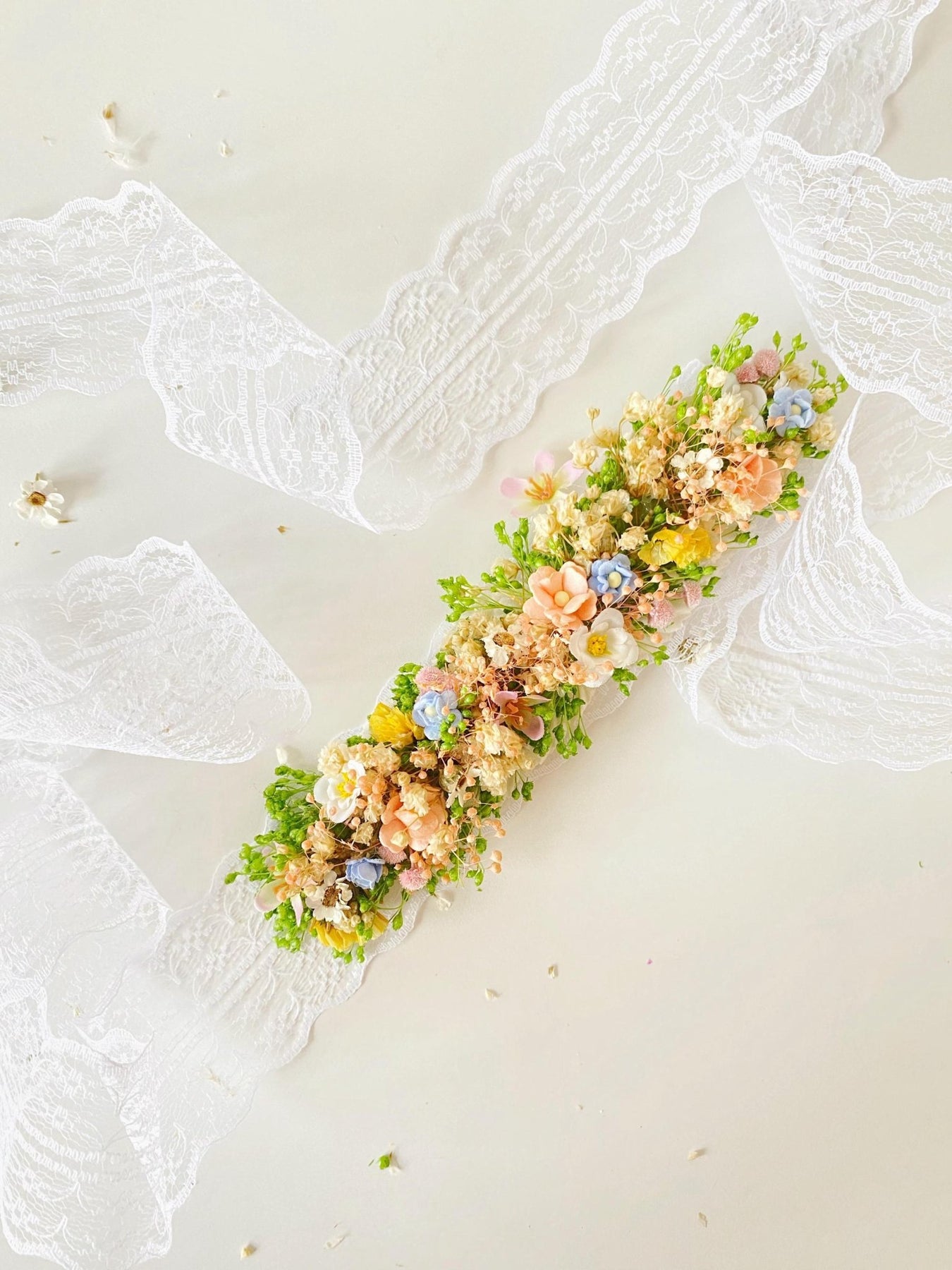 The flower belt is made from artificial and preserved materials, lace and other material used for arranging.