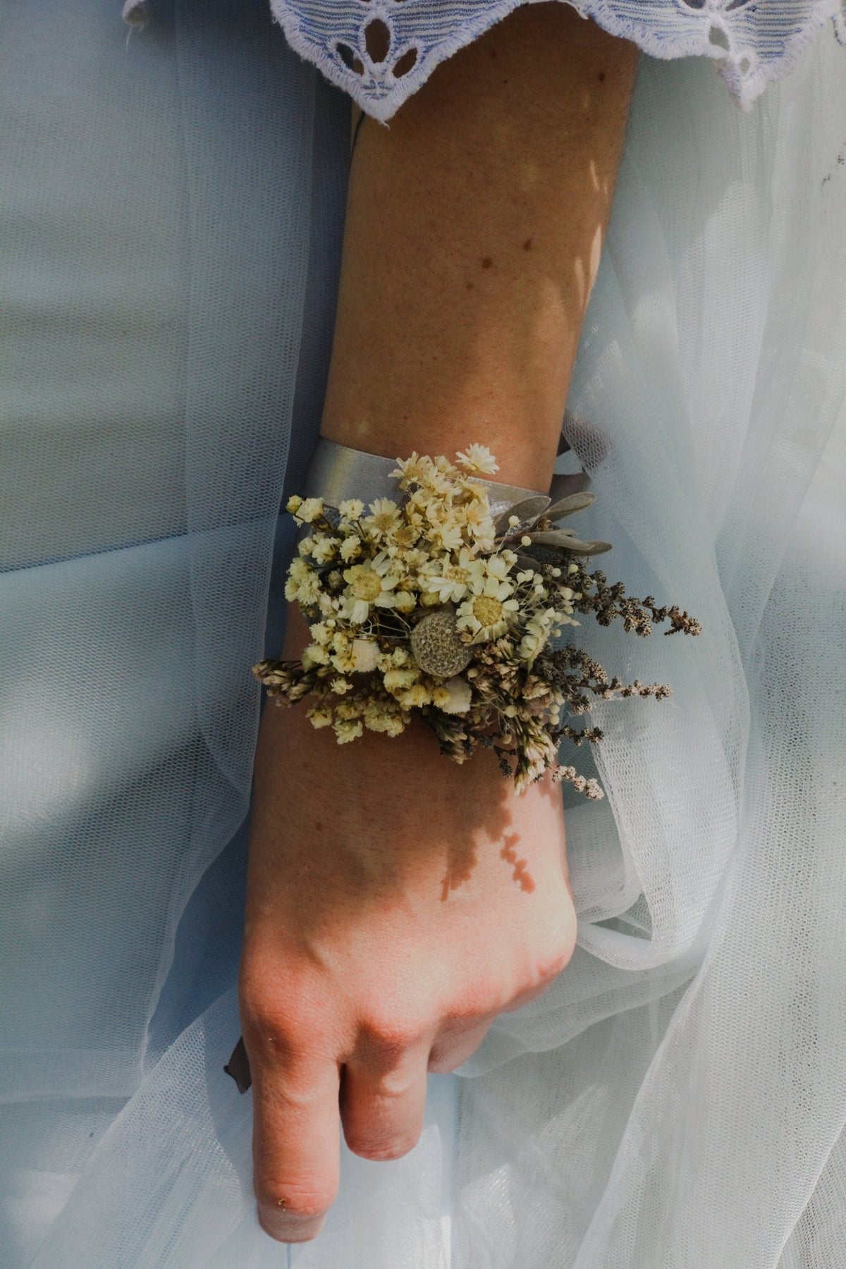 Preserved Baby's Breath Flower Bracelet - Ivory Wedding Corsage – handmade floral hair accessory by magaela