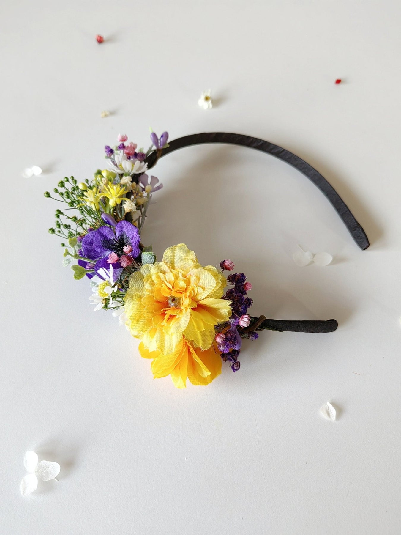 Romantic wedding flower headband in yellow and purple tones. Universal size, for adults and for children too.