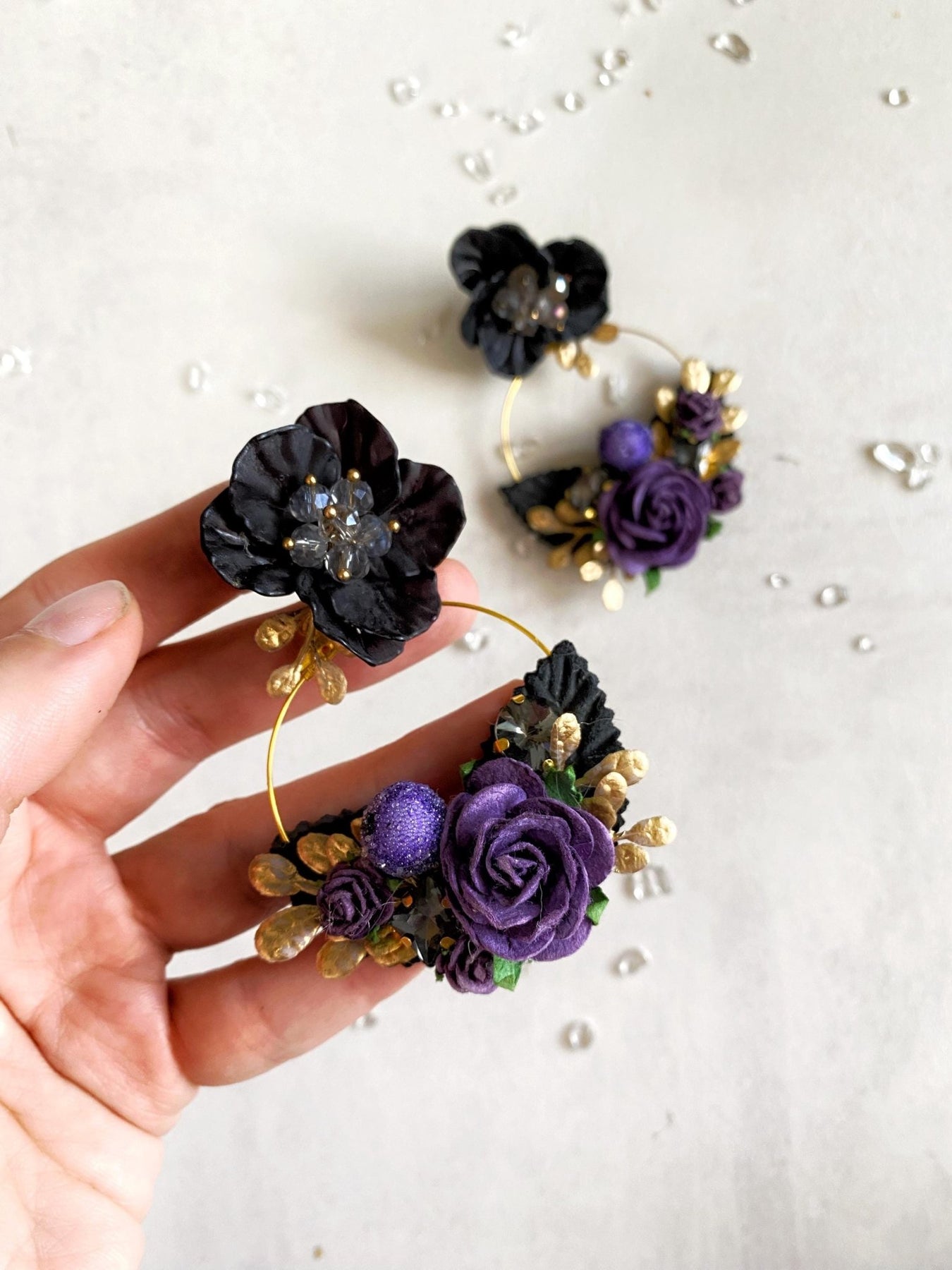 Purple & Gold Flower Earrings: Gothic Bridal Jewelry, 6cm Circle – handmade floral hair accessory by magaela