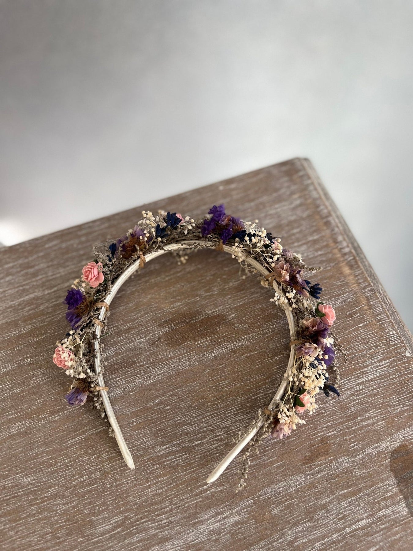 The flower hairband is made of artificial/fabric flowers, preserved flowers, leaves, grass and other trinkets used for arranging.