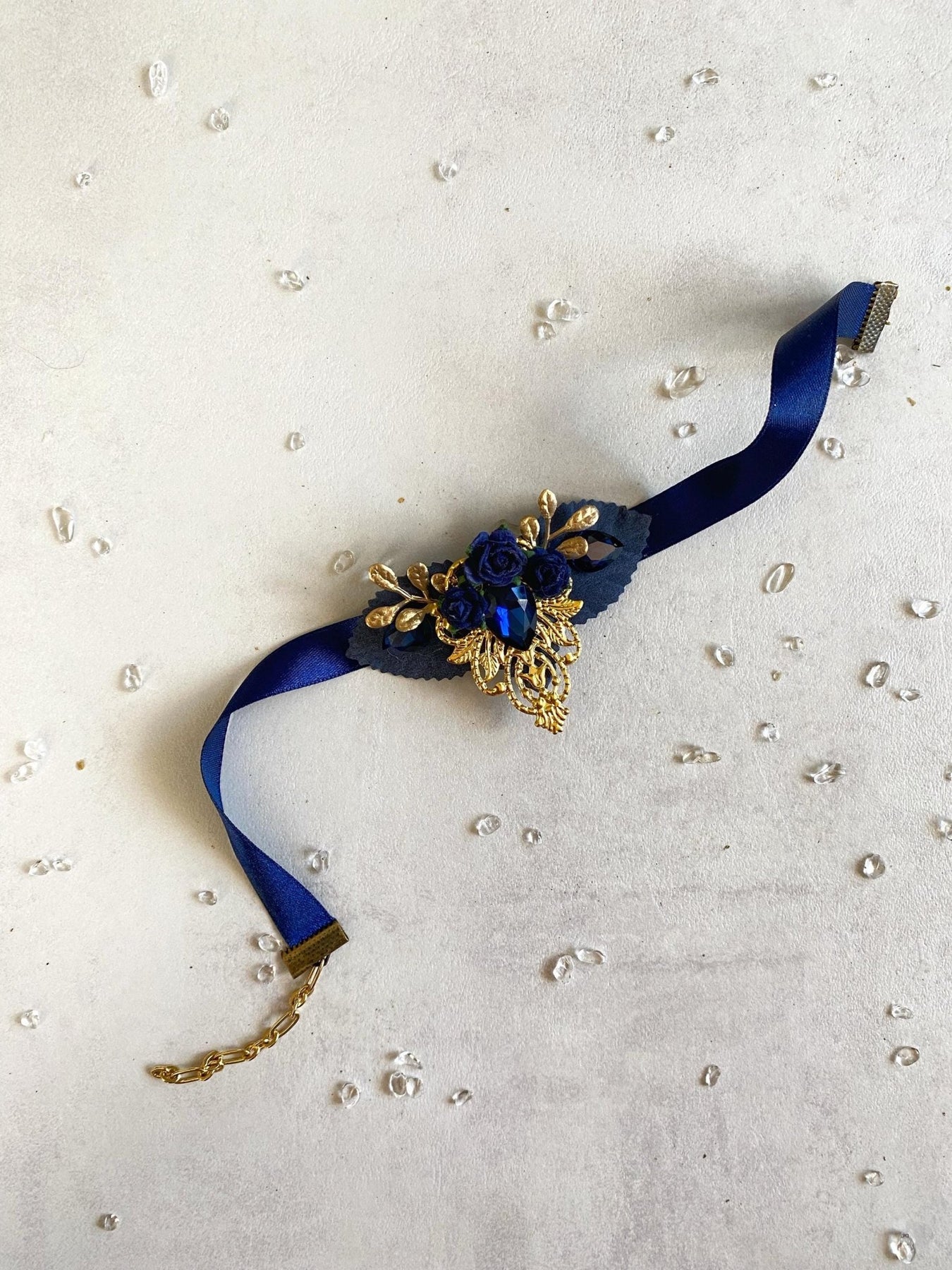 Royal Blue & Gold Glam Choker Necklace: Gothic Wedding Jewelry – handmade floral hair accessory by magaela