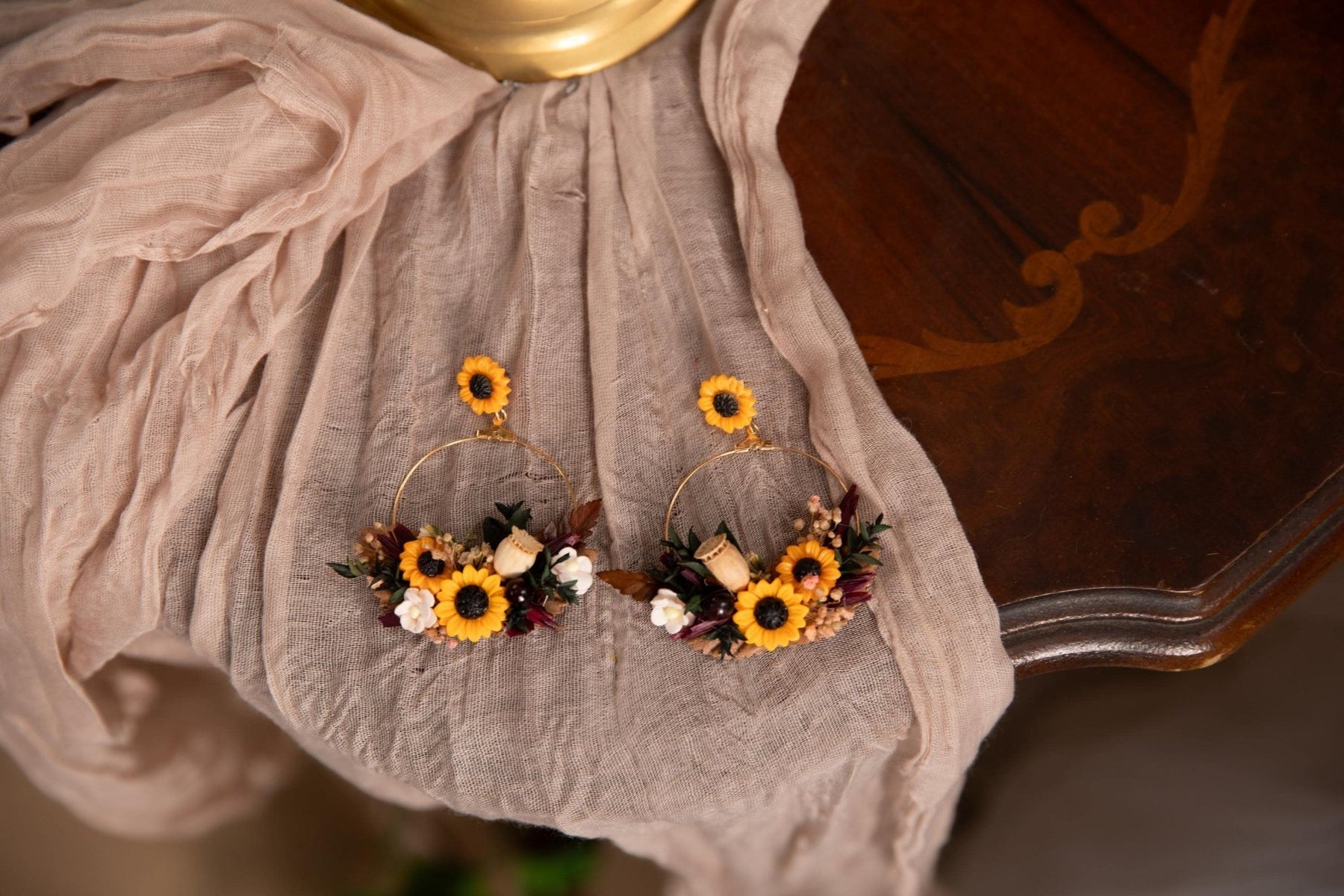 Sunflower Circle Earrings: Preserved Flower Wedding Jewelry – handmade floral hair accessory by magaela