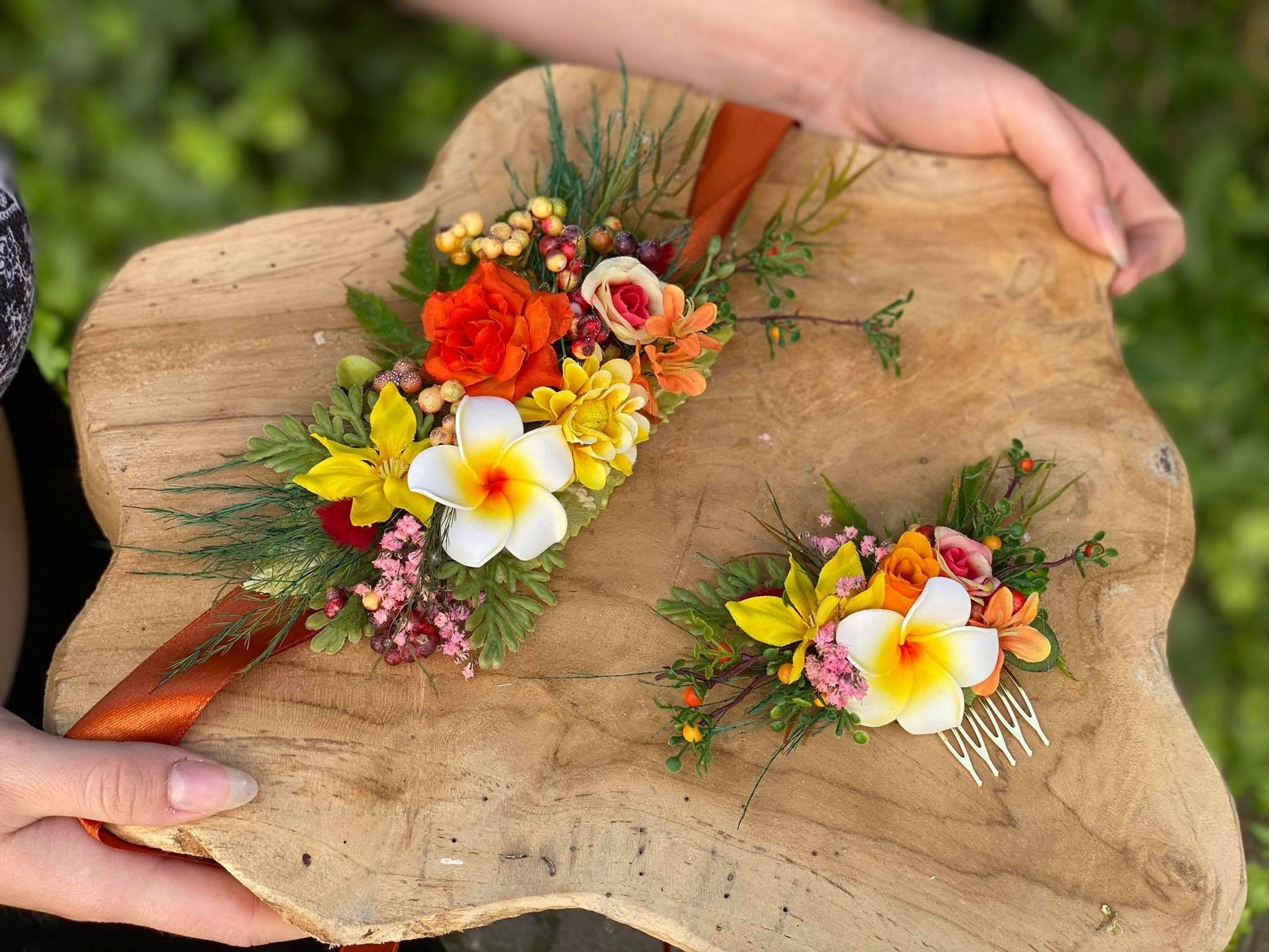 Can be combined with this matching hair comb: https://www.etsy.com/uk/listing/1027997768/exotic-wedding-hair-comb-plumeria-bridal?ref=shop_home_active_1&pro=1