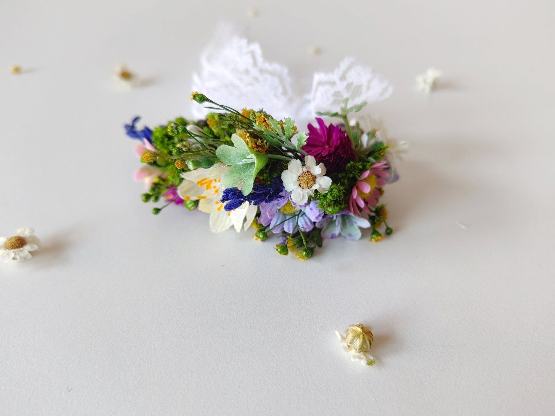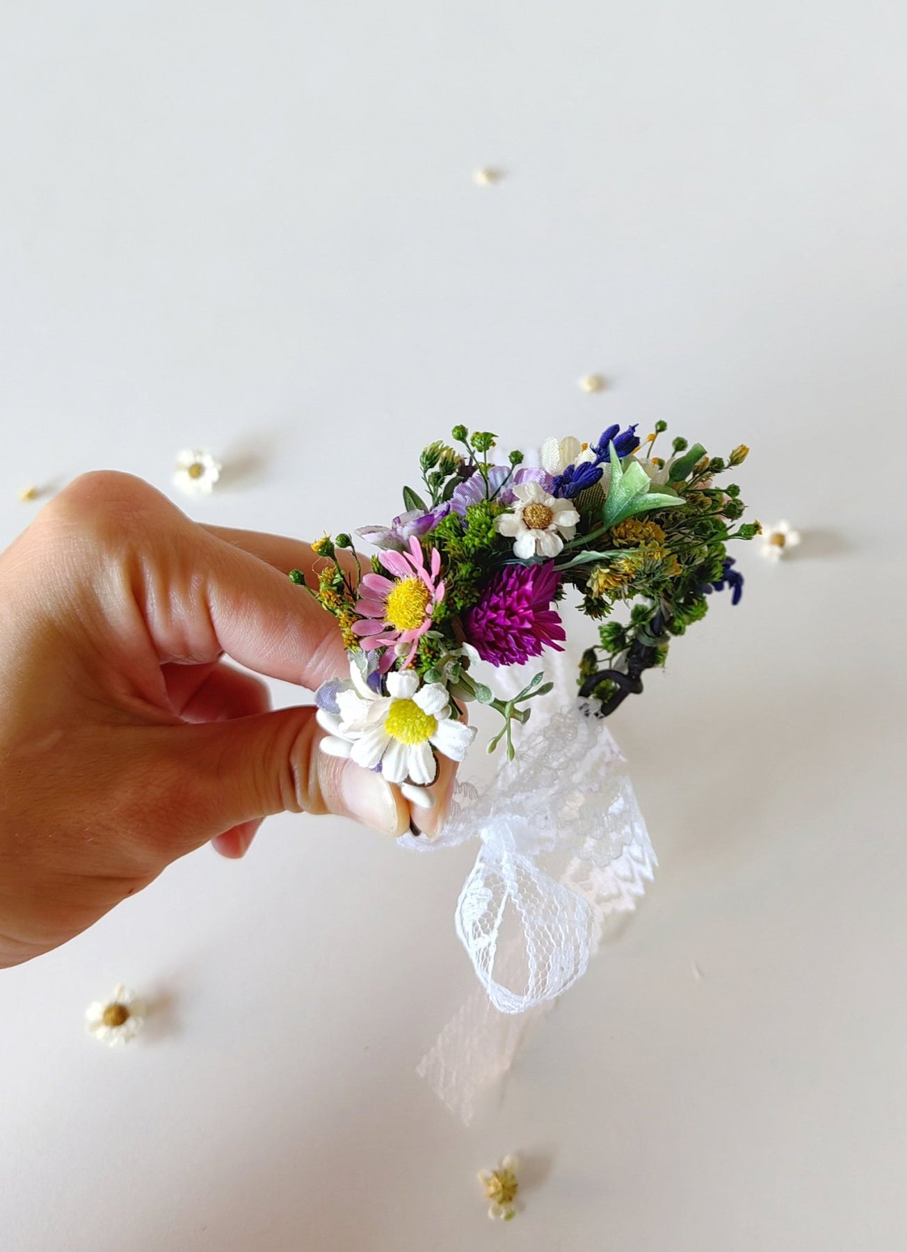 The flower bracelet is made of artificial flowers, preserved flowers, lavender, grass, ribbon and other trinkets used for arranging.