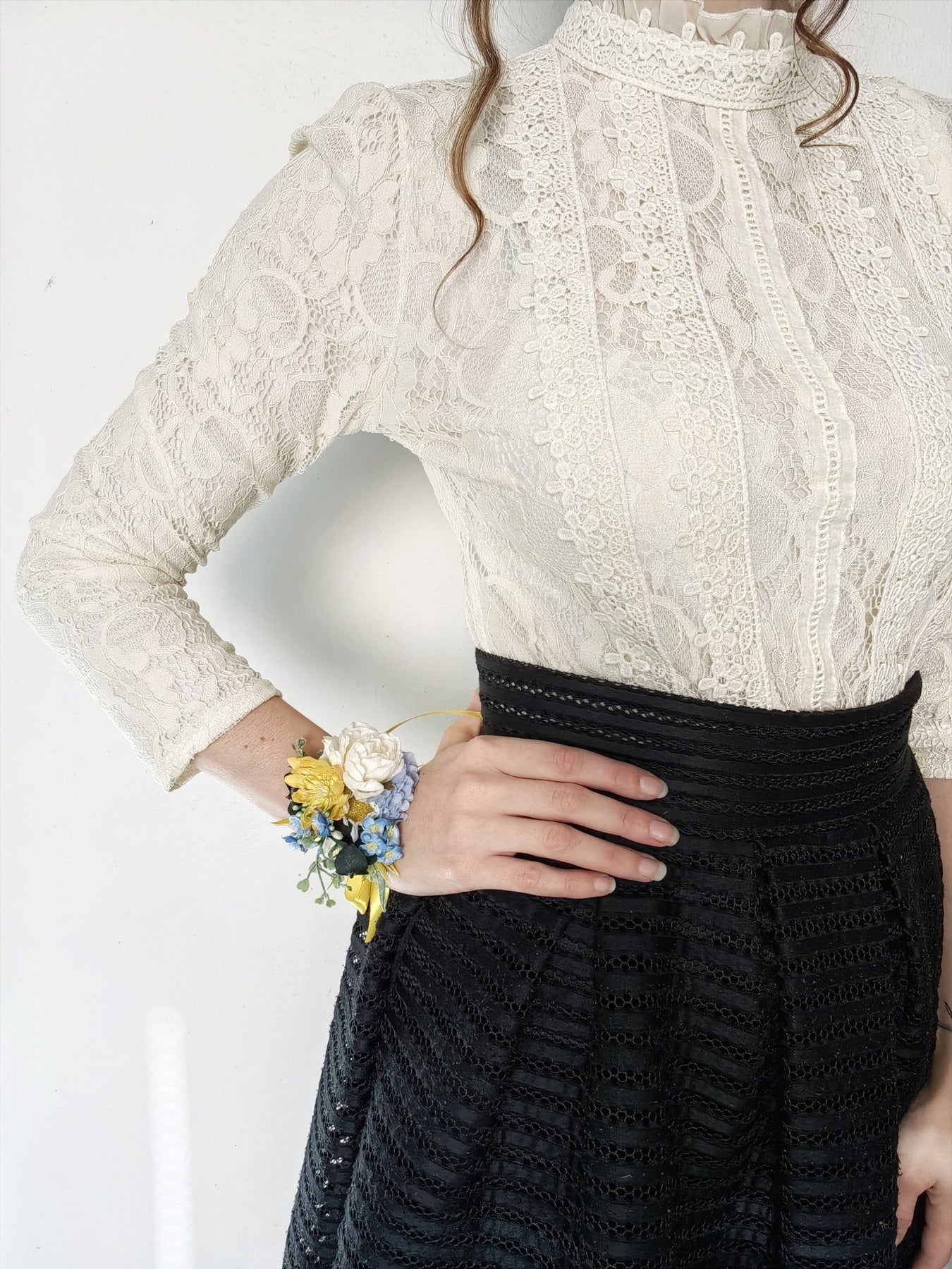 Romantic wedding flower bracelet in yellow and blue tones
