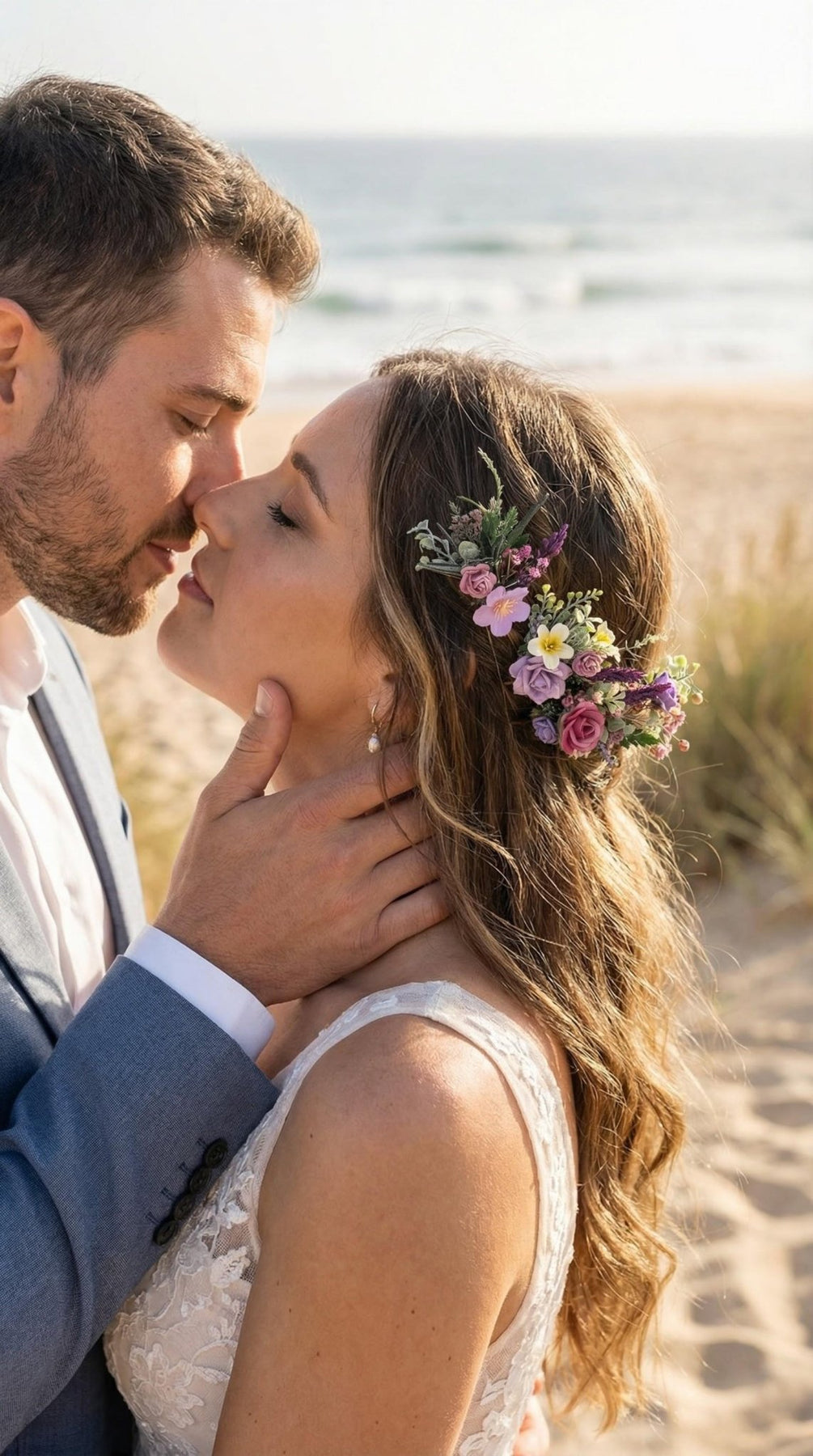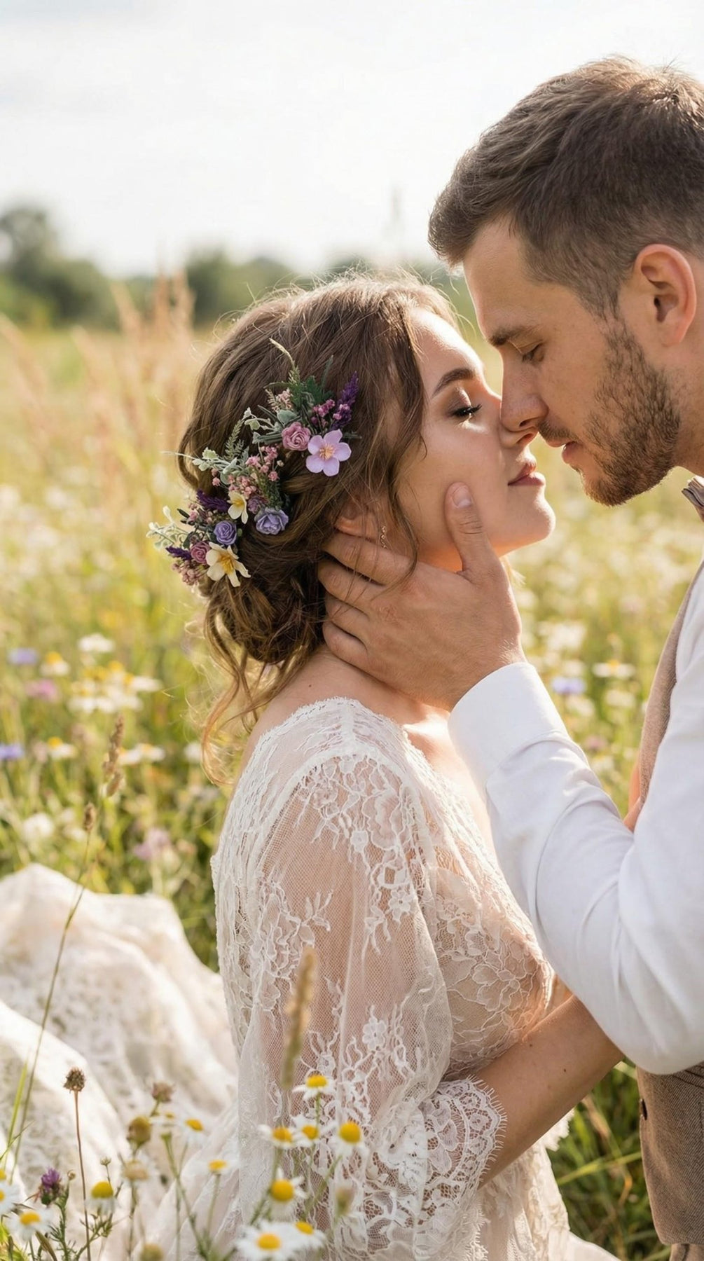 Inspired by delicate meadow flowers and soft sunset tones, this set creates a beautifully organic effect in the hairstyle. The combination of refined artificial flowers and preserved greenery adds depth, texture, and timeless elegance.