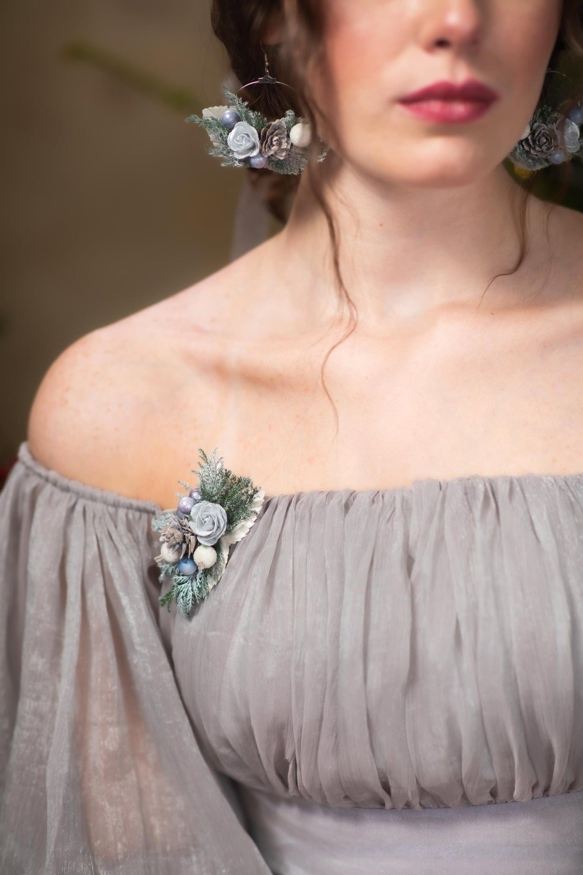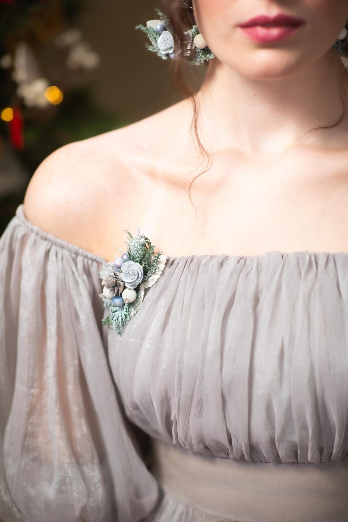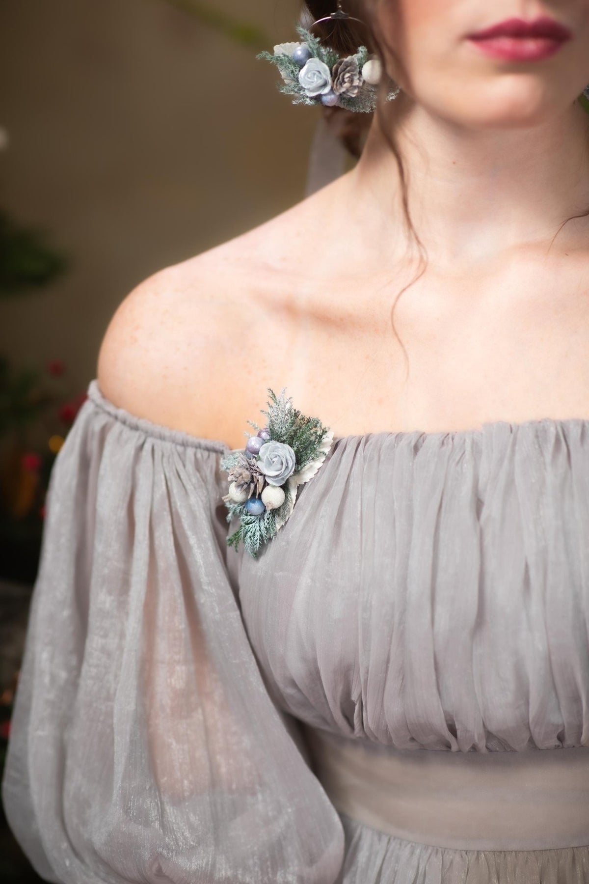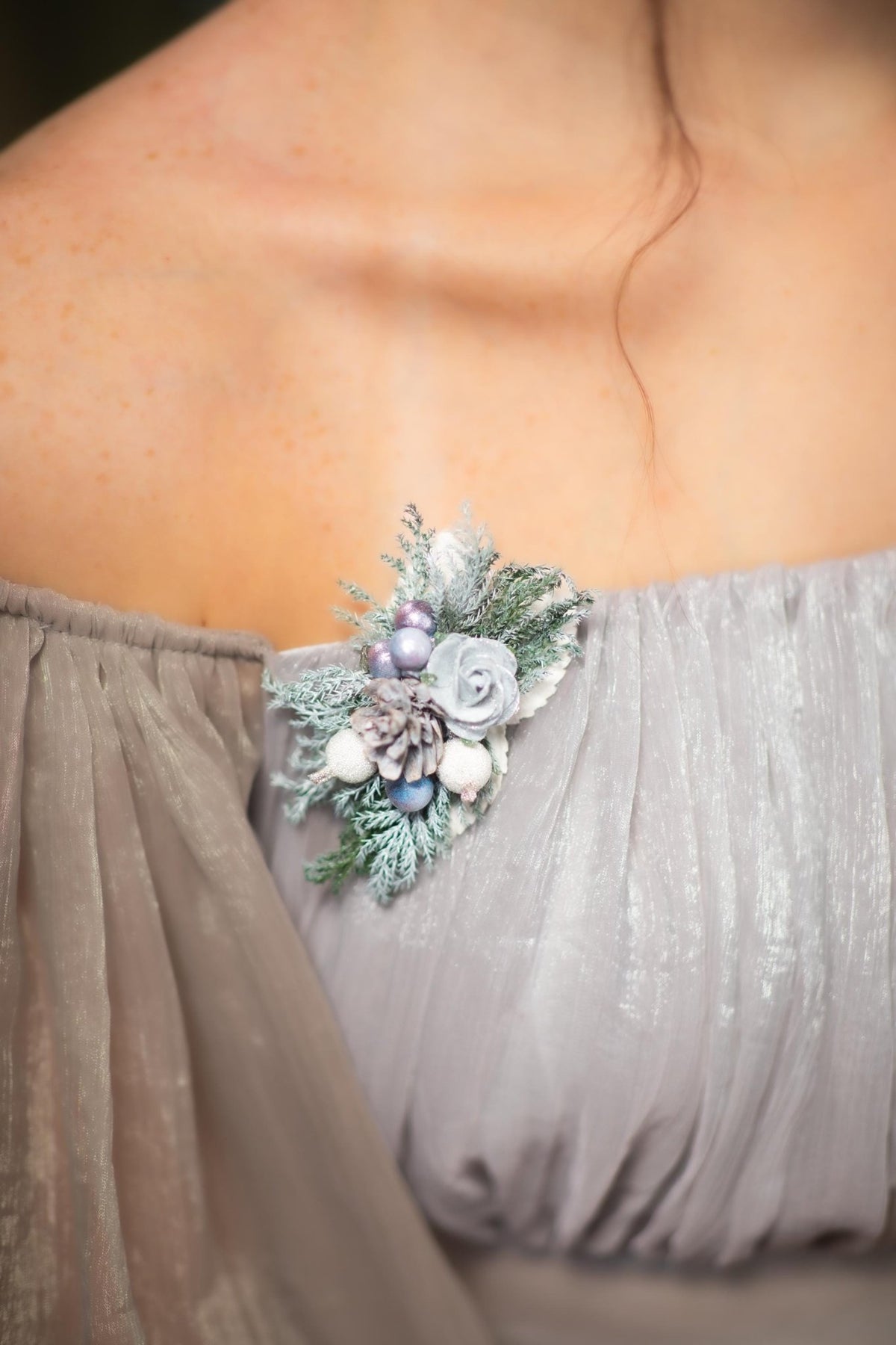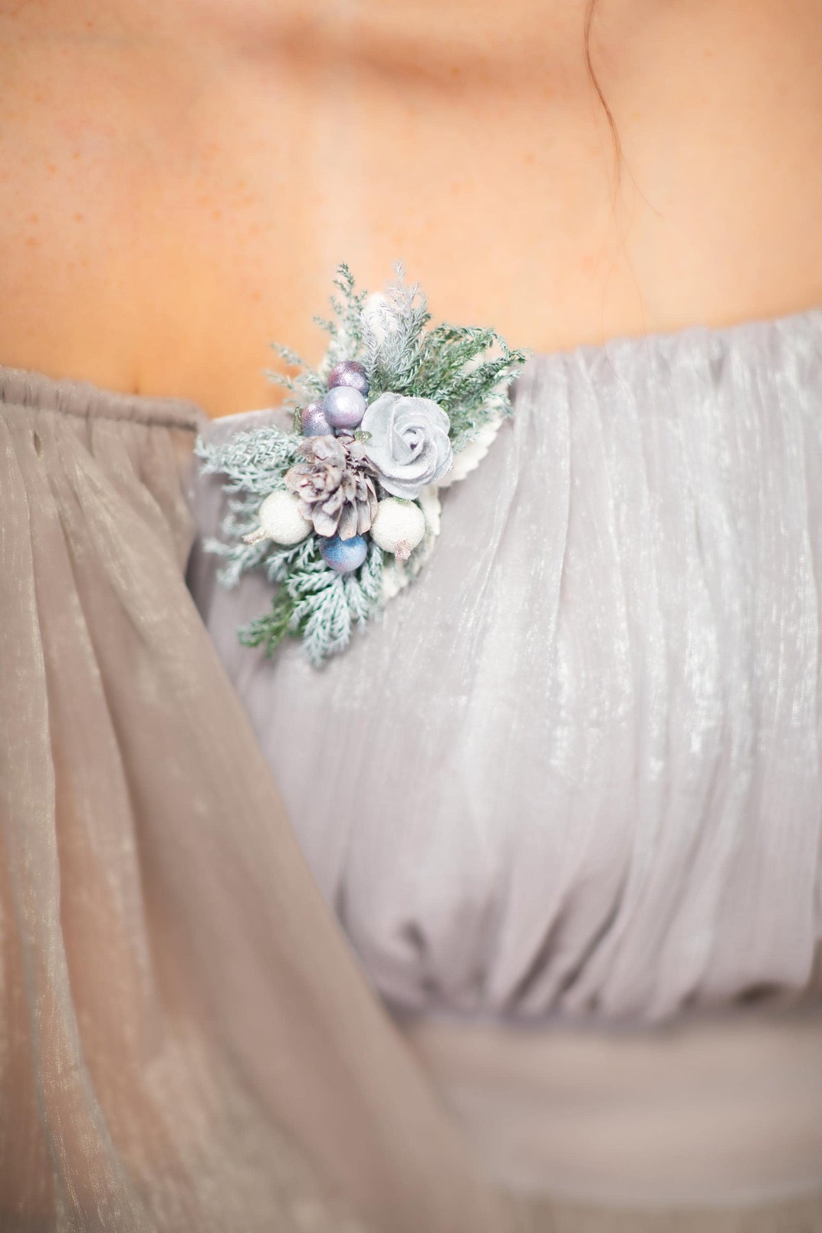 Like a frozen dream in white and blue tones with a silvery breath of winter. The combination of white roses, forest needles, pine cones and bluish blueberries creates an elegant jewellery - it looks as gentle and pure as the first frost. It hides the magic of winter nature. The ideal brooch for a winter wedding, but also for a New Year's Eve party or winter balls.