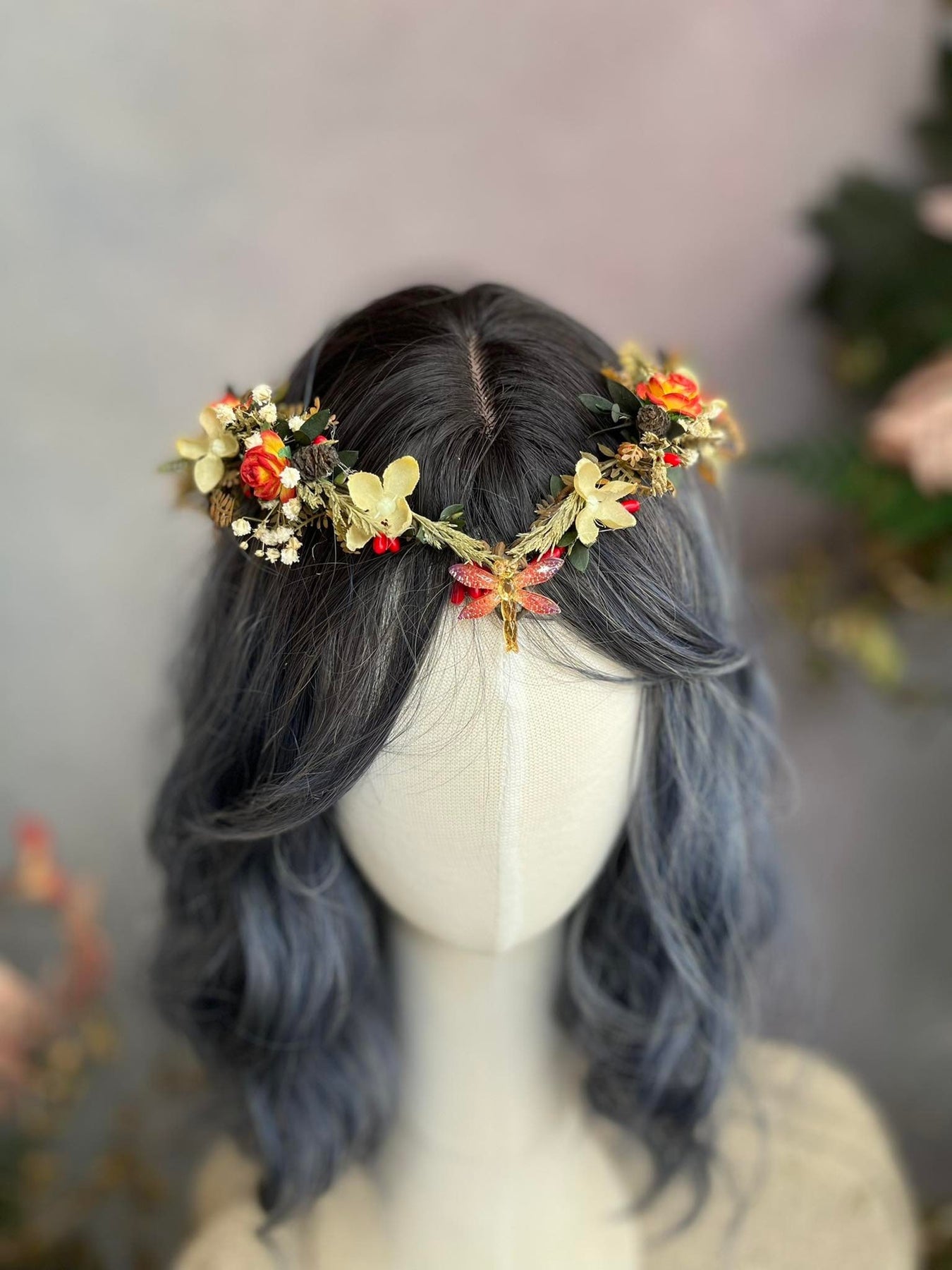 Autumn Wedding Flower Crown: Elven Fairy Tiara with Dragonfly – handmade floral hair accessory by magaela