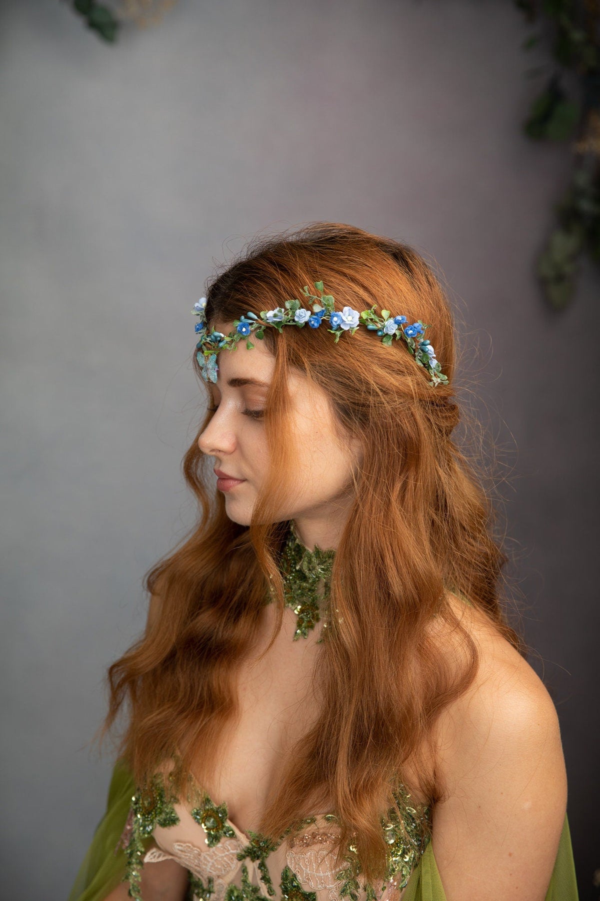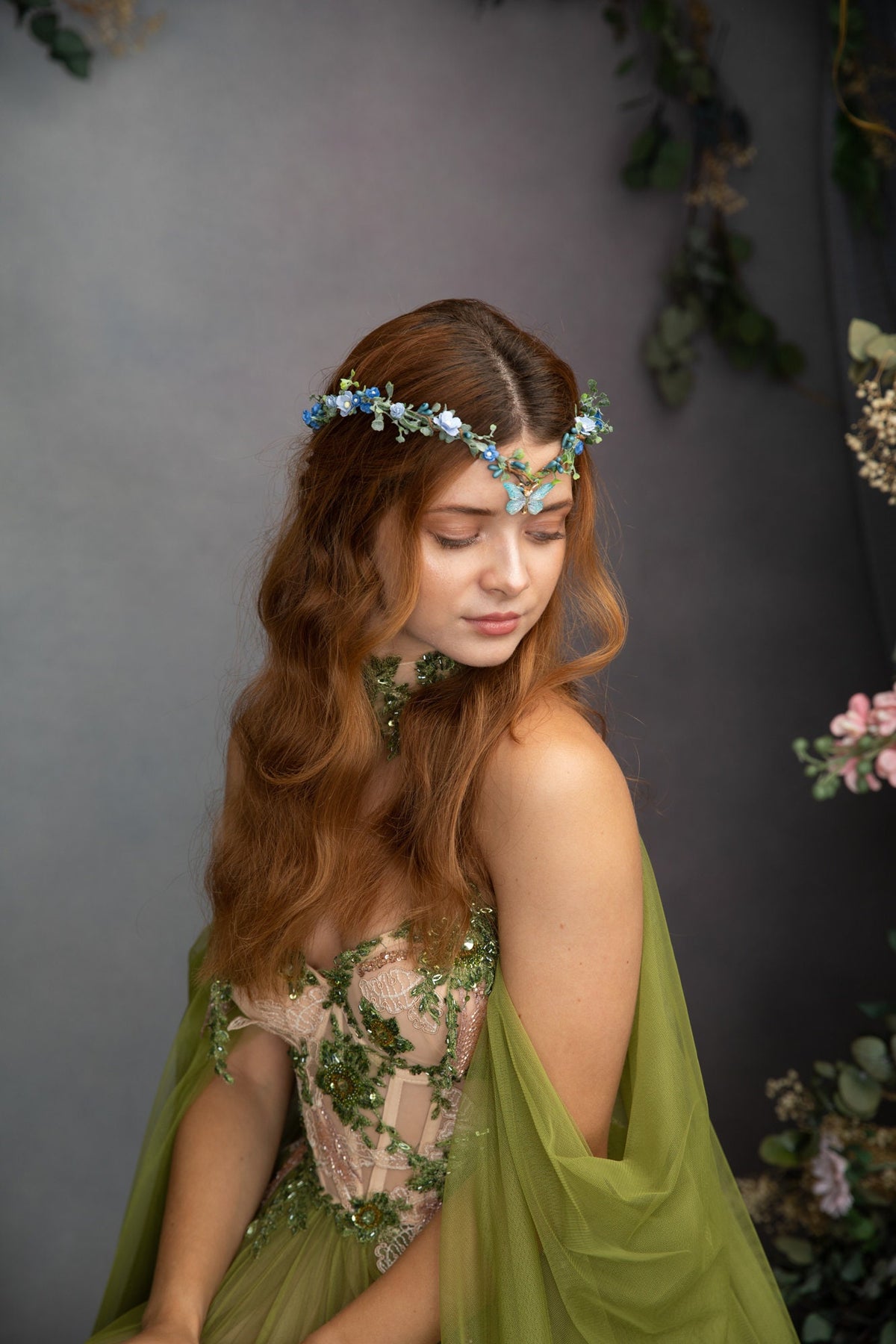 Blue Flower Butterfly Crown: Bridal Elven Tiara – handmade floral hair accessory by magaela