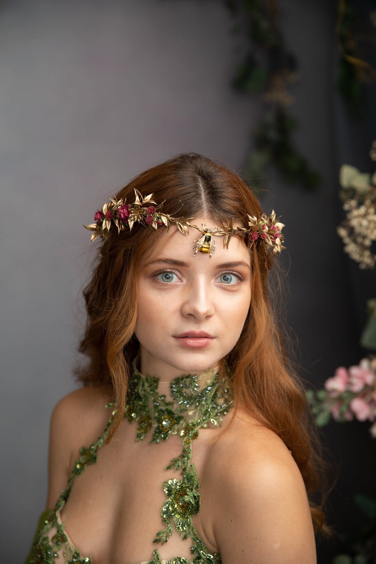 Flower Elven Tiara: Golden Burgundy Fairy Crown with Bee – handmade floral hair accessory by magaela