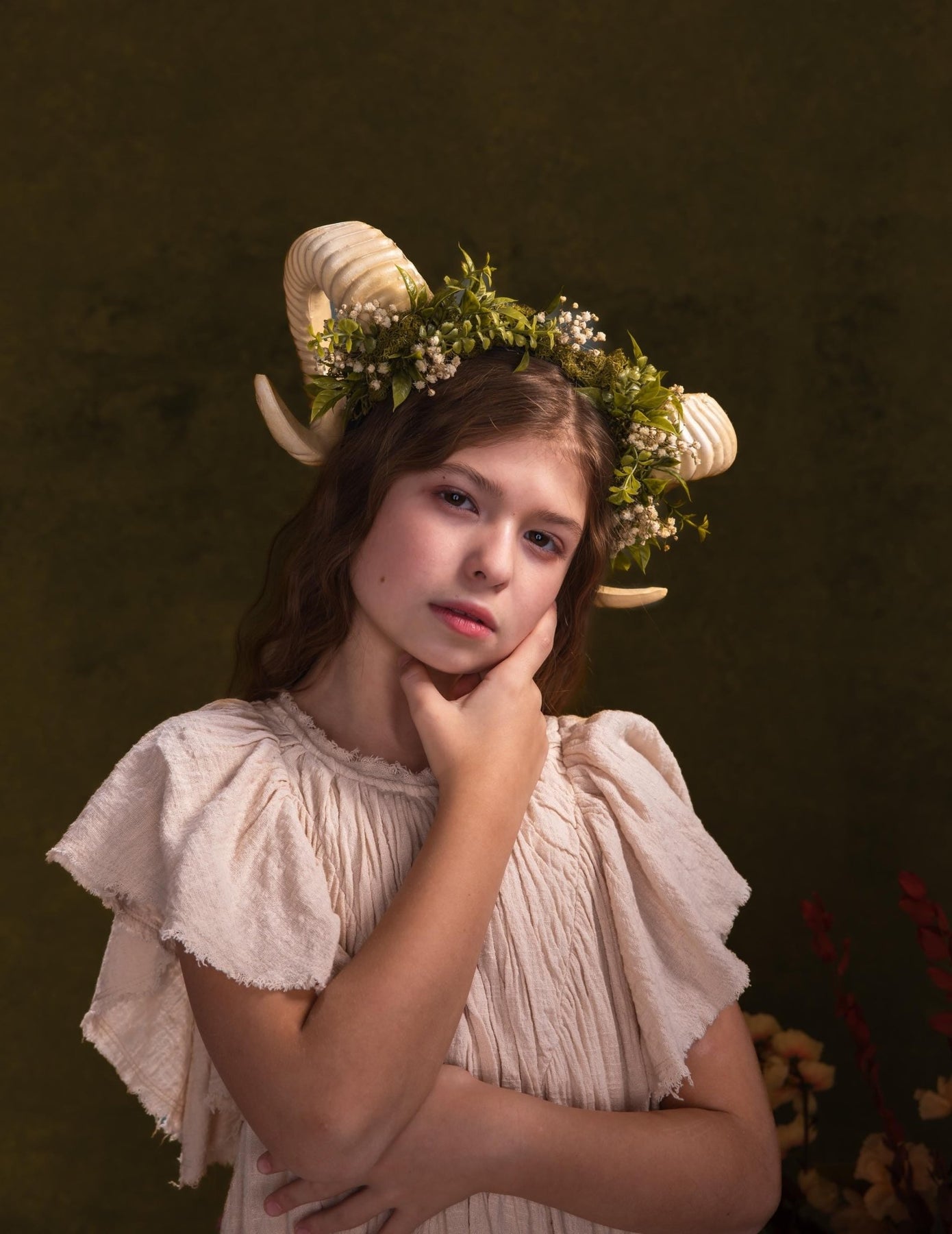 This headband has artificial ram horns (not real horns of a live animal) in beige color. The headband is made of artificial greenery complemented by live preserved gypsophila - this combination creates a unique natural decor that is soft, fresh, natural, but at the same time it is a beautiful, distinctive and magical accessory with a touch of mysticism, which makes it a unique accessory for Halloween or carnival.