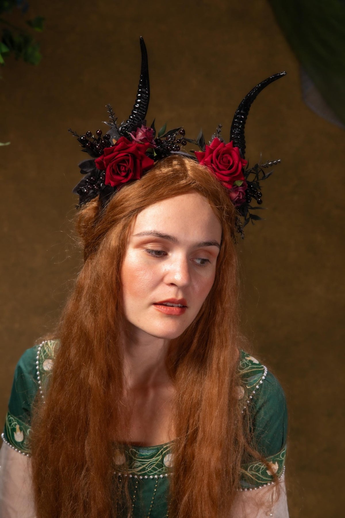 This headband has artificial goat horns (or antelope) (not real horns of a live animal) in black color. Thanks to these less pronounced animal horns, the headband is less extravagant, but still ready to attract and attract admiring glances. In culture and fashion, red and black are often combined to create a dramatic, striking and elegant contrast. And that's exactly what this headband is - dramatic, striking but still elegant. Mysterious and passionate. The base is made up of beautiful roses that complement black berries. ItΒ΄s designed for all women who are not afraid to show their passion and inner strength.