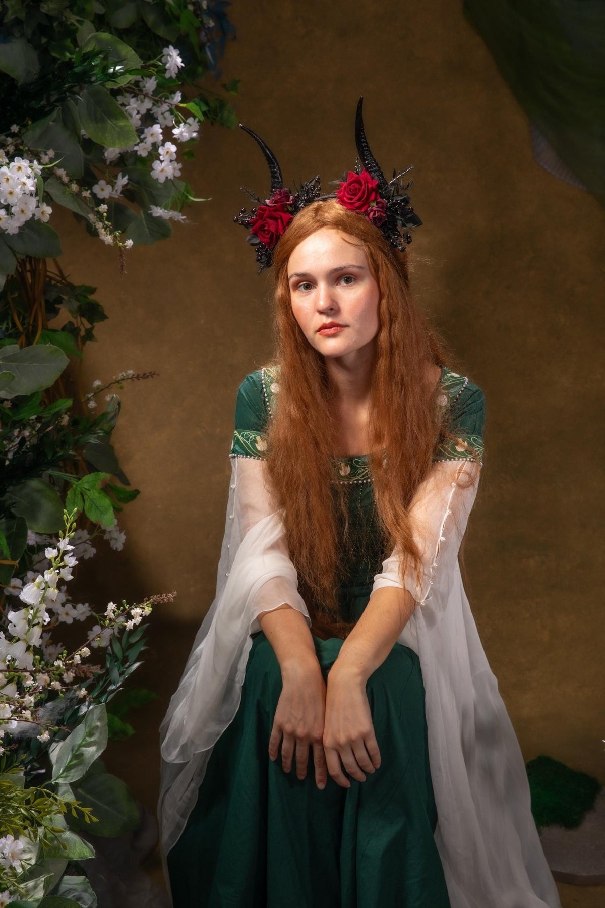 Red Rose & Black Horns Crown: Gothic Pagan Headpiece – handmade floral hair accessory by magaela