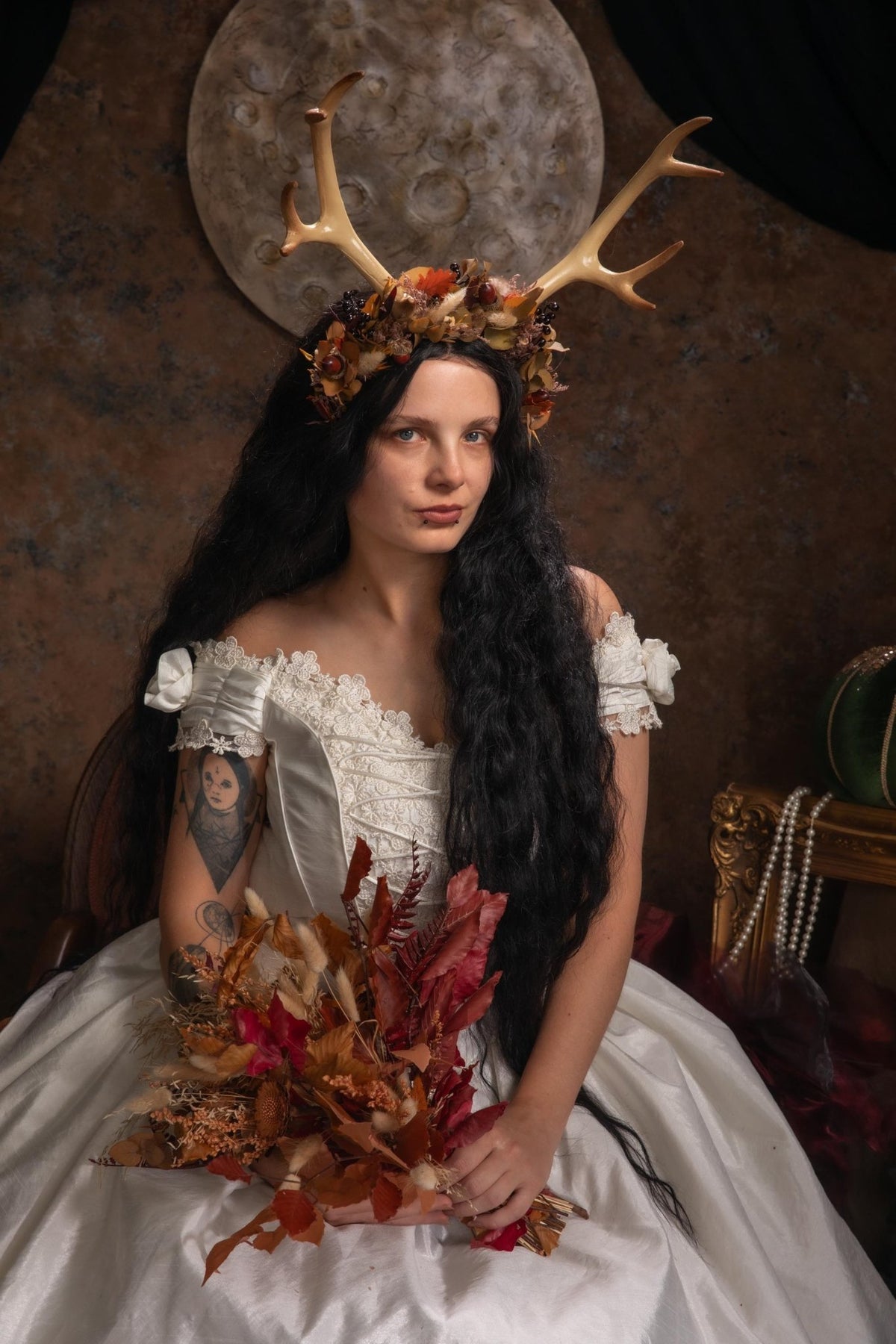 Perfect for PAGAN festival. Flower headband with (not real) antlers/horns in beige color :) Headband is full of autumn atmosphere - is like a walk through a forest full of rustling autumn leaves and acorns. It contains material that gives a truly autumnal rustic feel. The headband is perfect for a fantasy-style autumn wedding, but also as a cosplay or Halloween accessory...