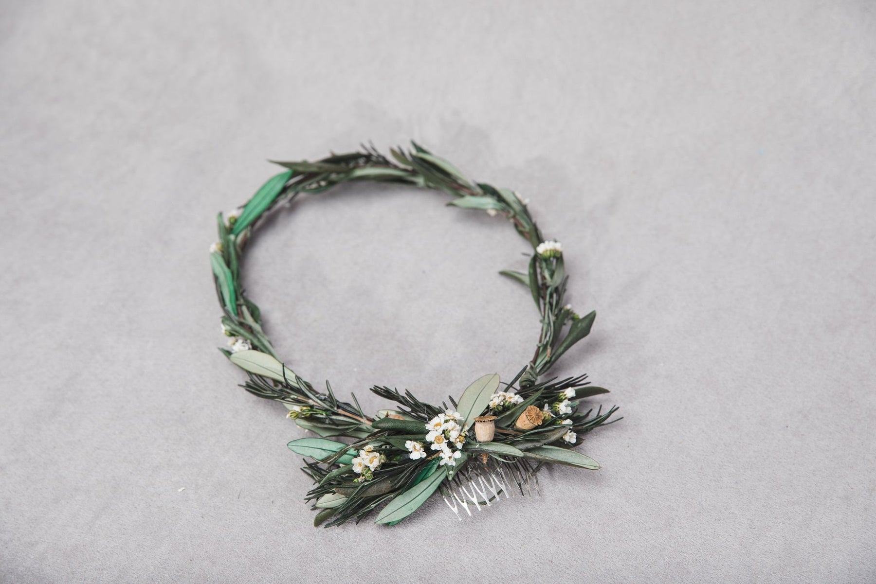 Boho Wedding Hair Comb and Wreath: Olive Leaf Greenery Set – handmade floral hair accessory by magaela