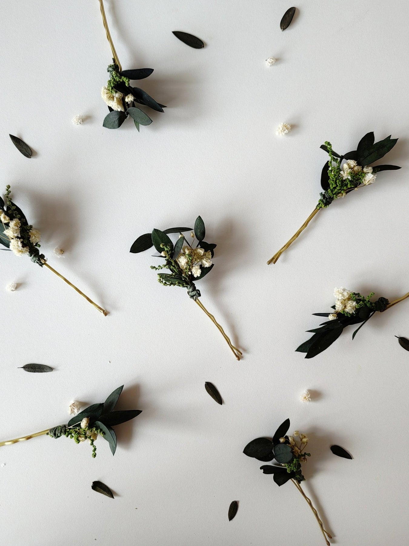 The flower hair pins are made of preserved flowers, leaves and floristic tape.