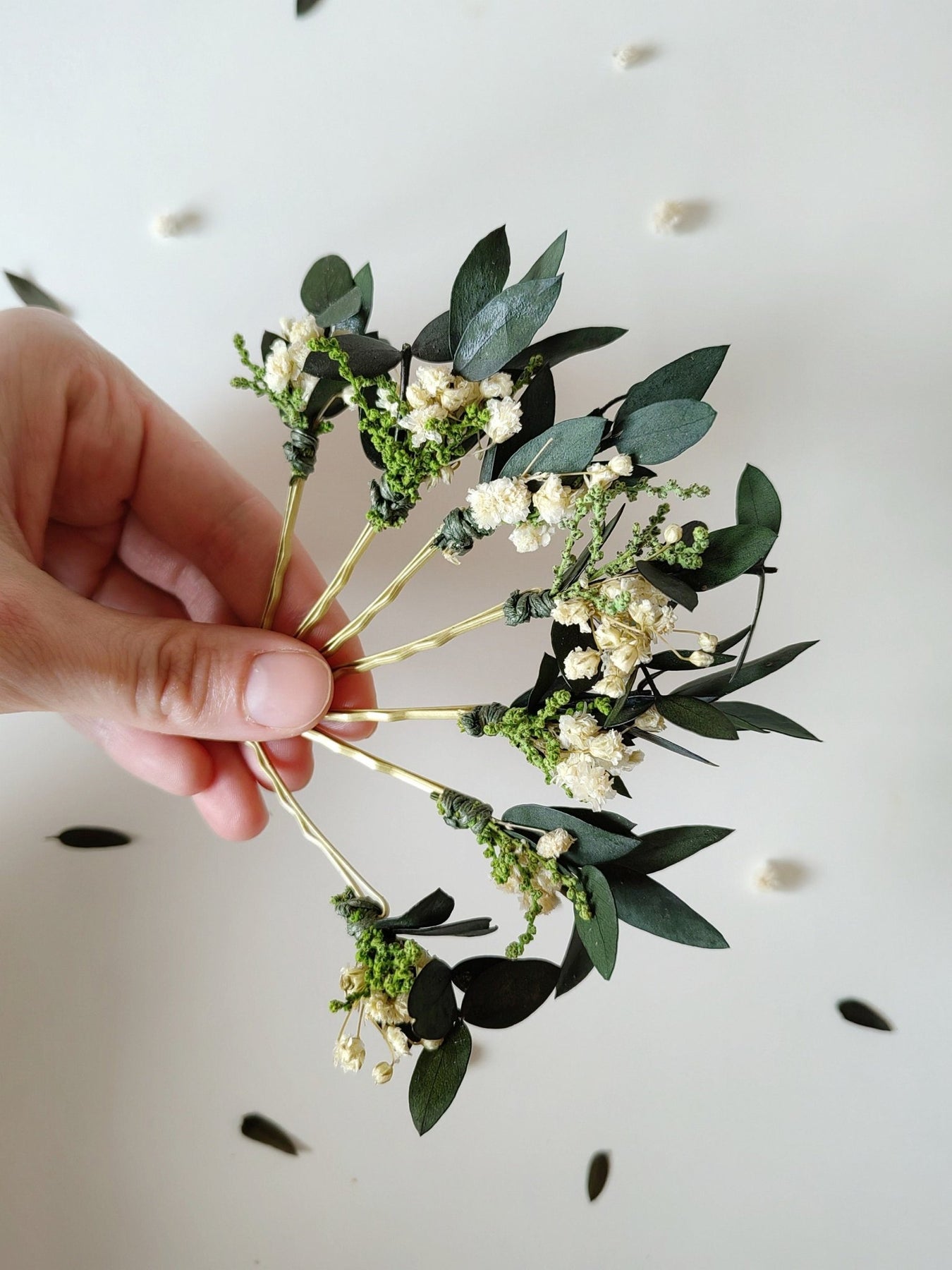 Eucalyptus Baby's Breath Hair Pins: Greenery Wedding Headpiece
