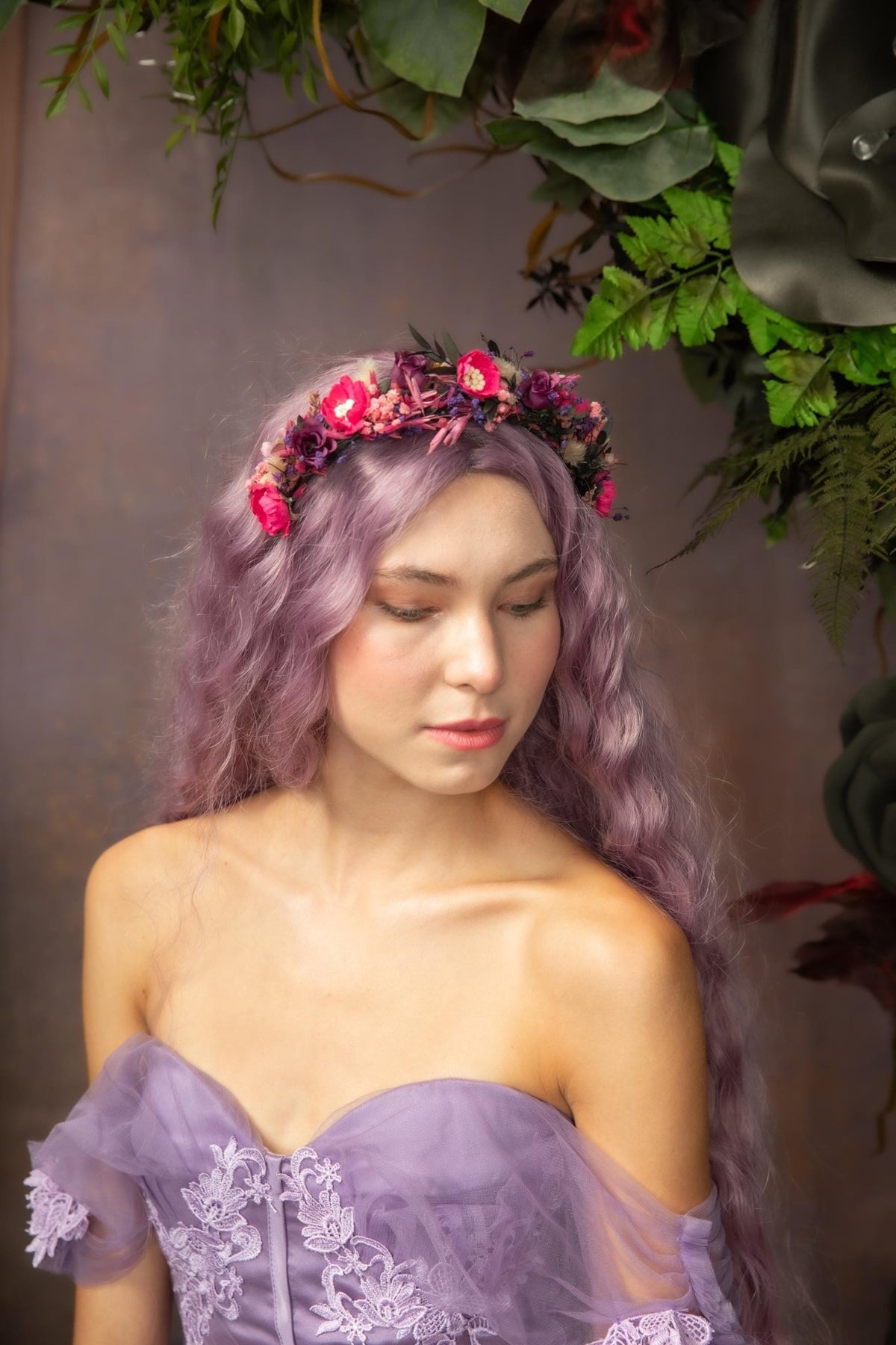 Magenta and purple wedding flower headband. Universal size, for adults and for children too.