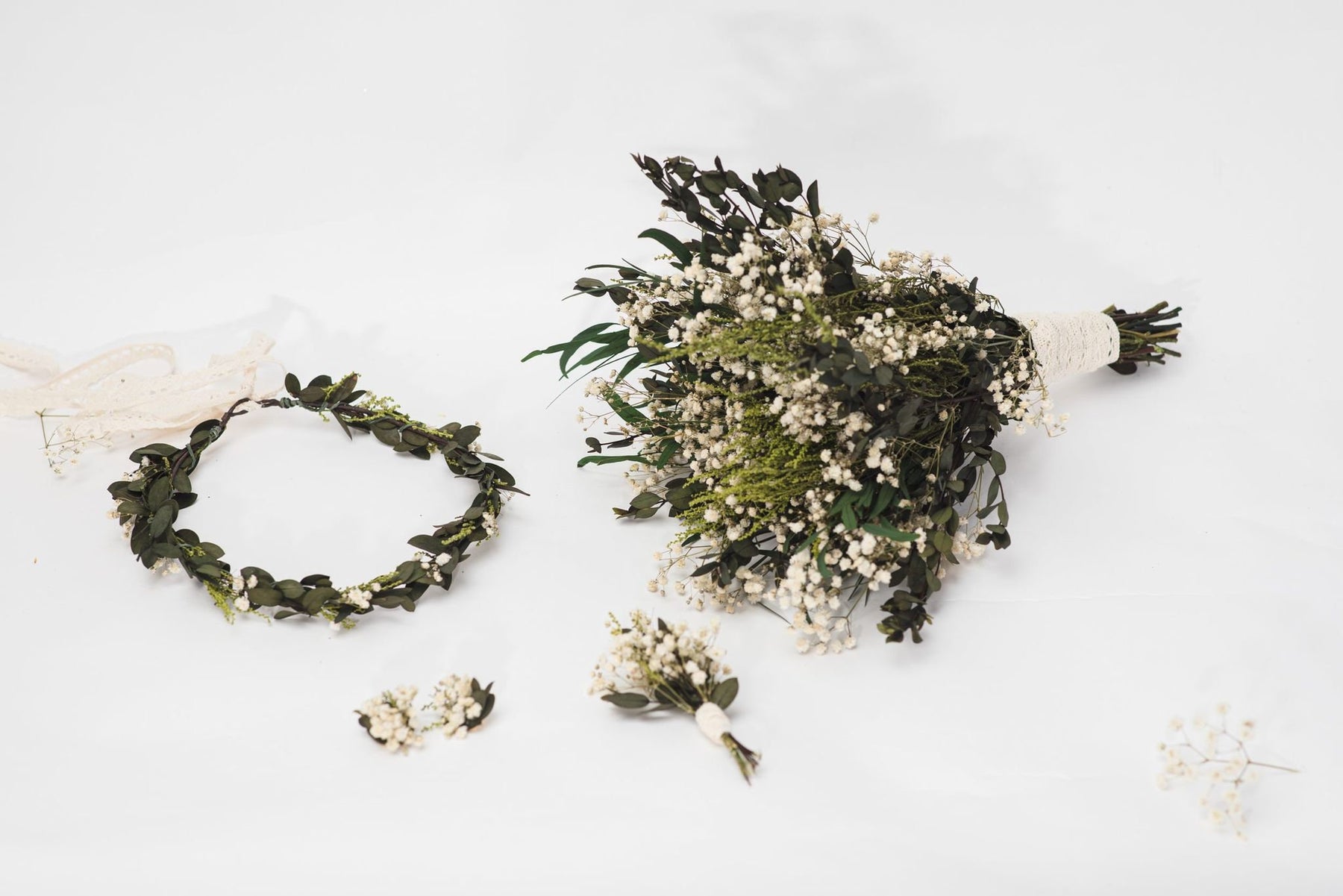 The bouquet is made of preserved flowers, preserved eucalyptus leaves, grass, ribbon and other trinkets used for arranging.