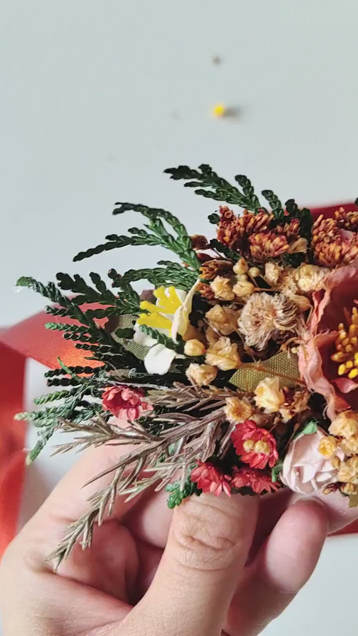 The flower belt is made of artificial/fabric flowers, preserved materials, satin ribbon and other trinkets used for arranging.