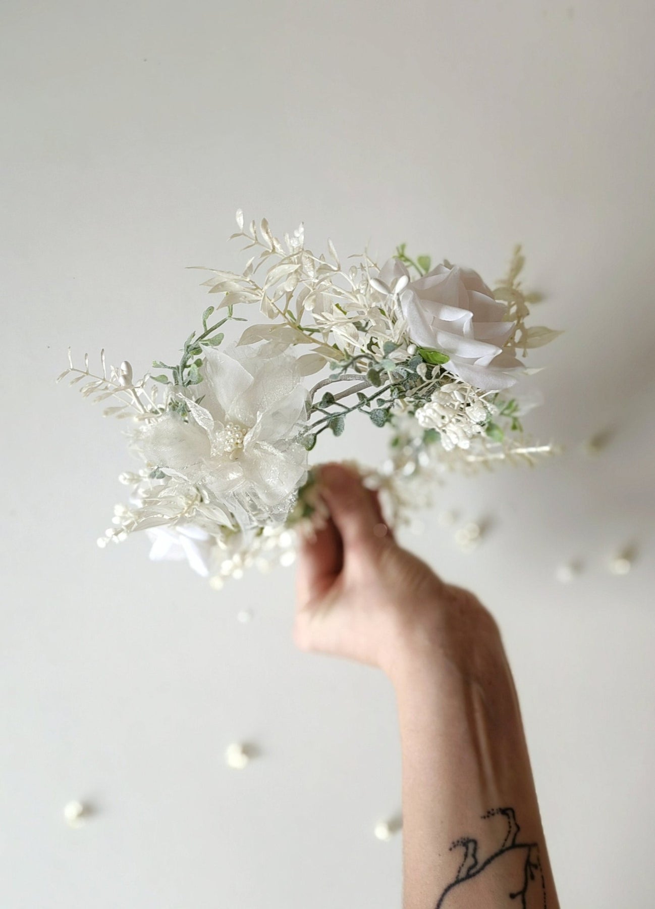 This hair wreath is made of artificial flowers and preserved materials. Elegant headpiece handcrafted with love.