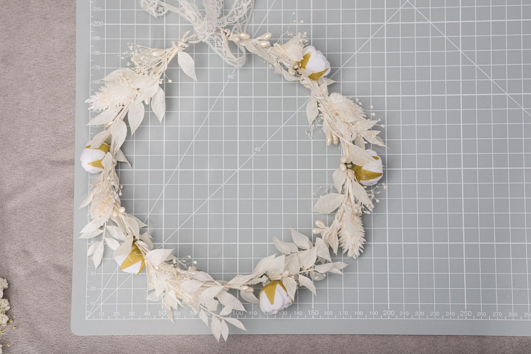 This hair wreath is made of high quality realistic looking textile/fabric flowers, white peonies, and leaves and preserved material which can fall off sometimes - it doesn't mean the headpiece is damaged, it is normal and it happens because this preserved material is fragile. Elegant headpiece handcrafted with love.