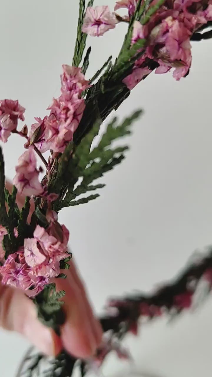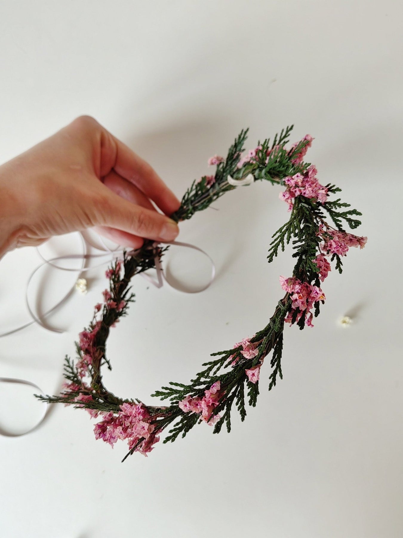 Hair wreath is made from preserved flowers and pine needles. Fragile natural material. Some dried flowers may fall off. It is normal and it shouldn't affect the overall design.