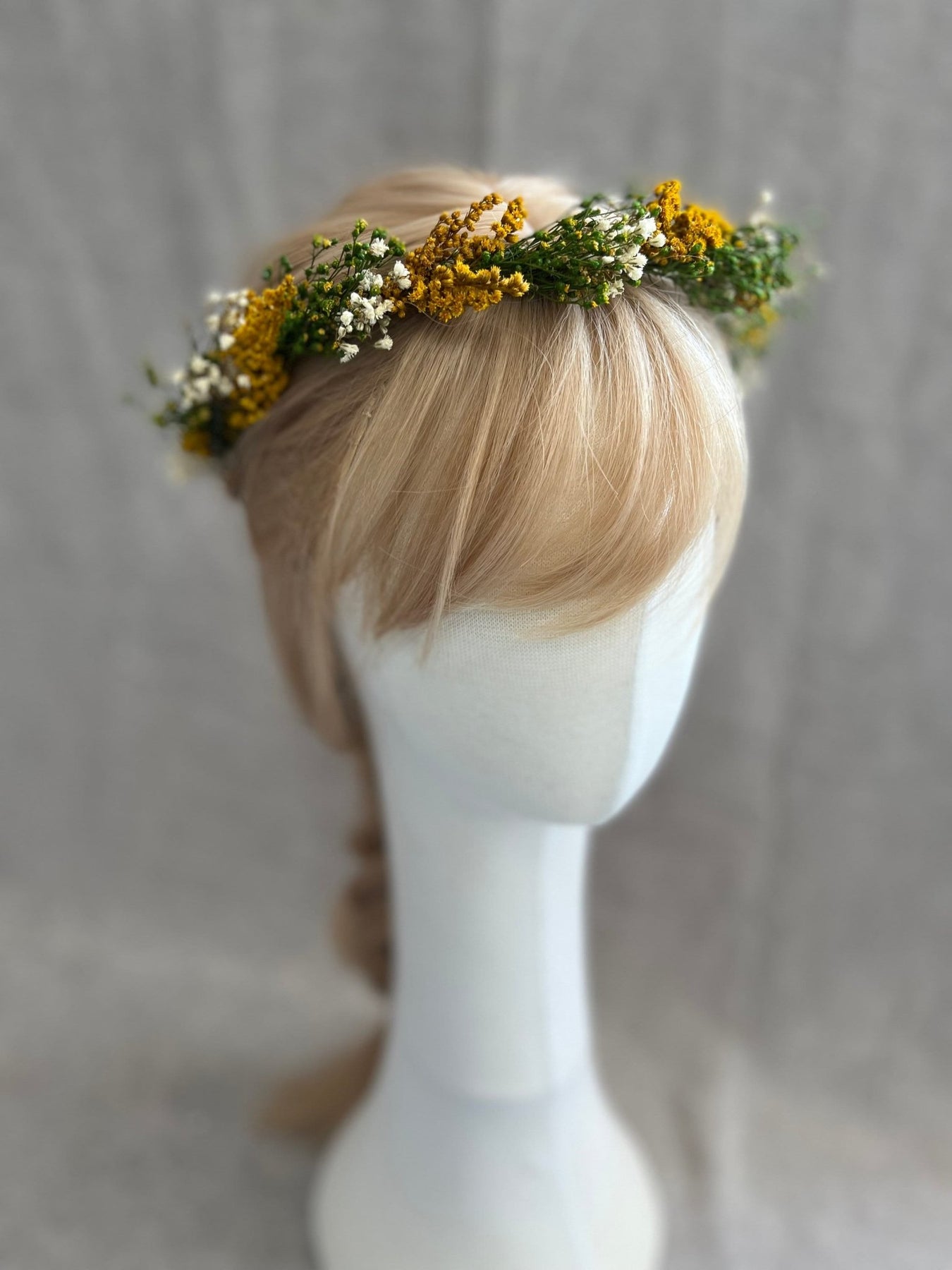 Preserved Flower Hair Wreath: Green, Ochre & Ivory Bridal Crown – handmade floral hair accessory by magaela