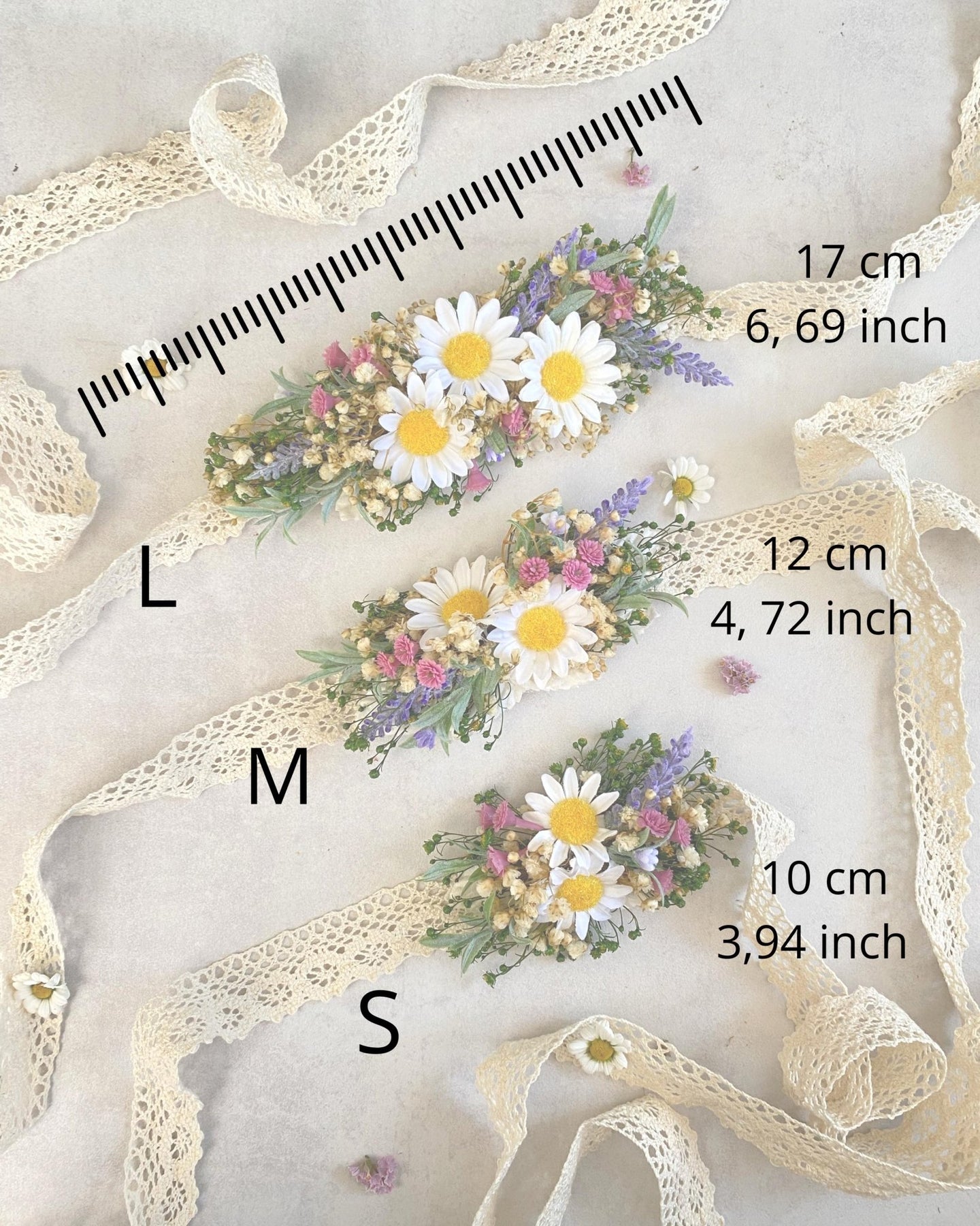 This one is in size M and is made of textile flowers, artificial and preserved materials. The base is a buckle - you can apply it to lace, ribbon, or your own collar (we can adjust the size according to your dog's collar)
