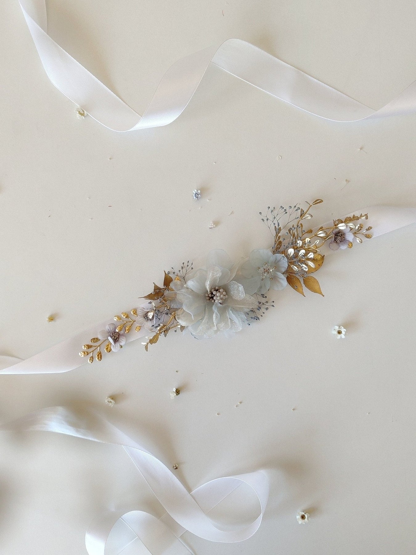 Vintage Mint & Gold Flower Belt: Cottagecore Bridal Accessory – handmade floral hair accessory by magaela