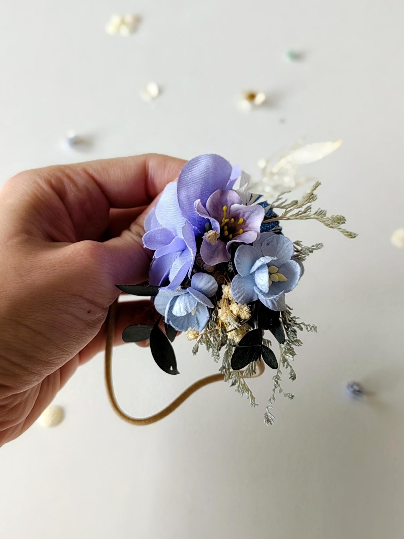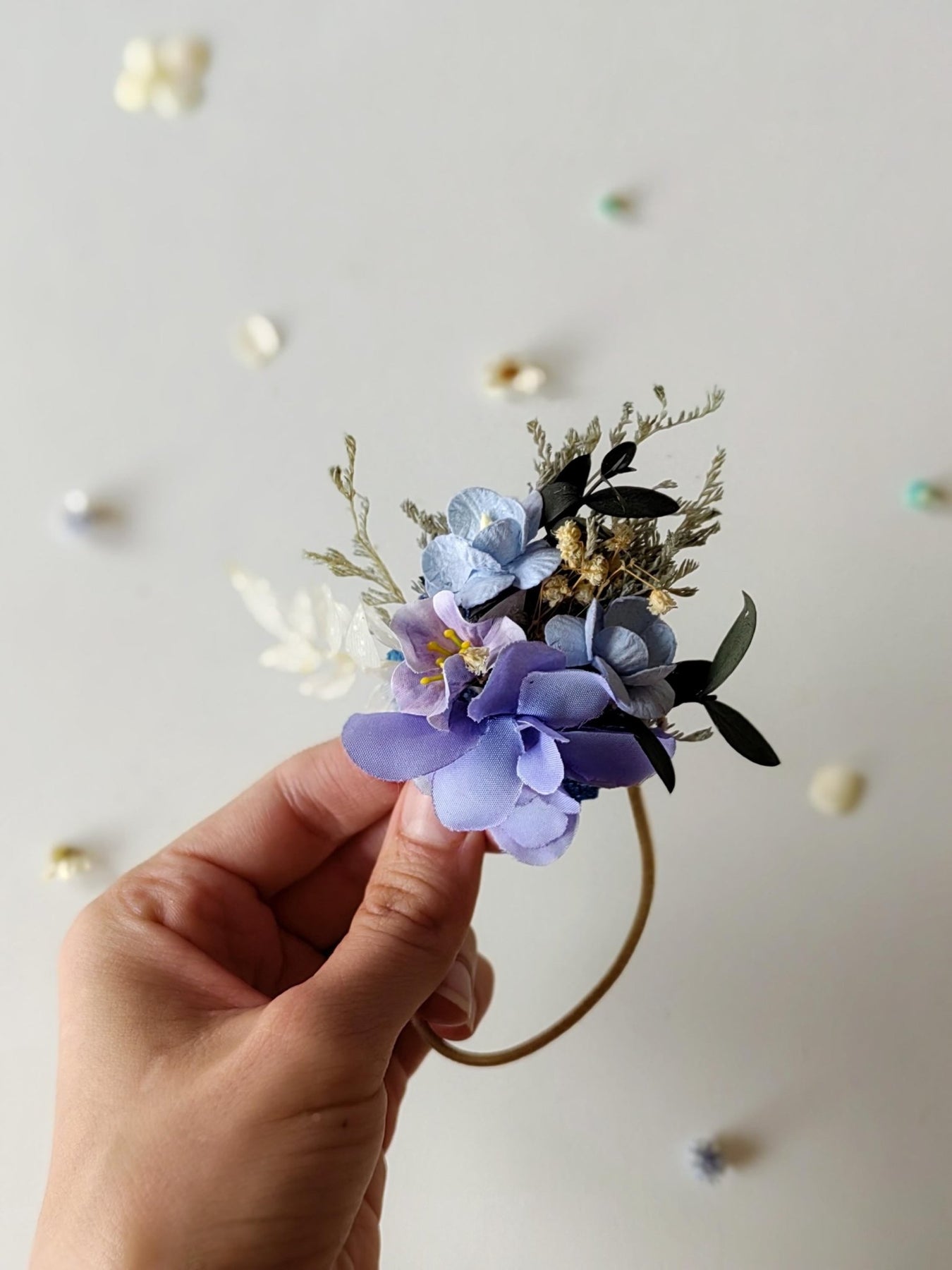 The flower hair tie is made of artificial flowers, leaves, grass, preserved material and other trinkets used for arranging.