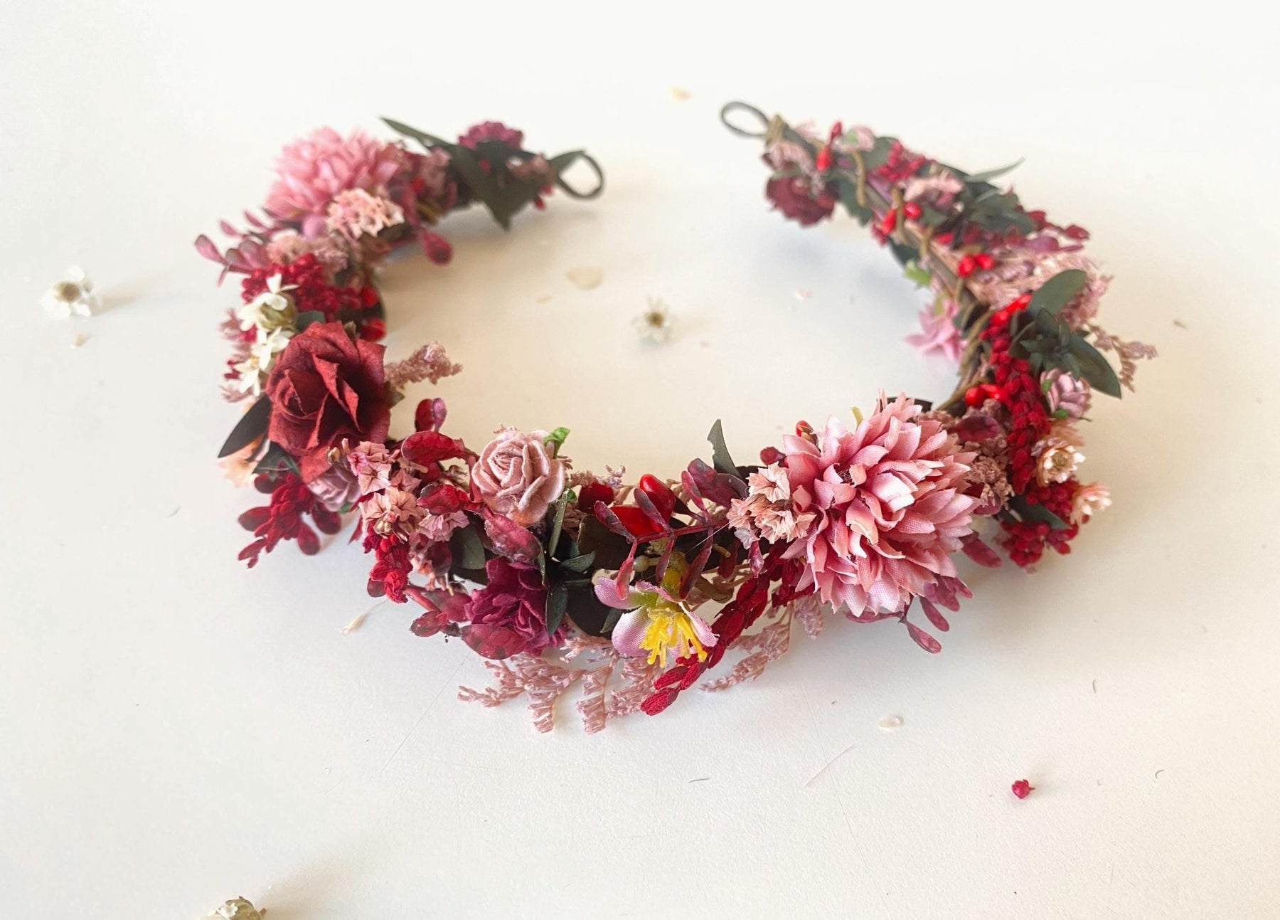 Burgundy Pink Flower Half Wreath: Boho Wedding Crown – handmade floral hair accessory by magaela