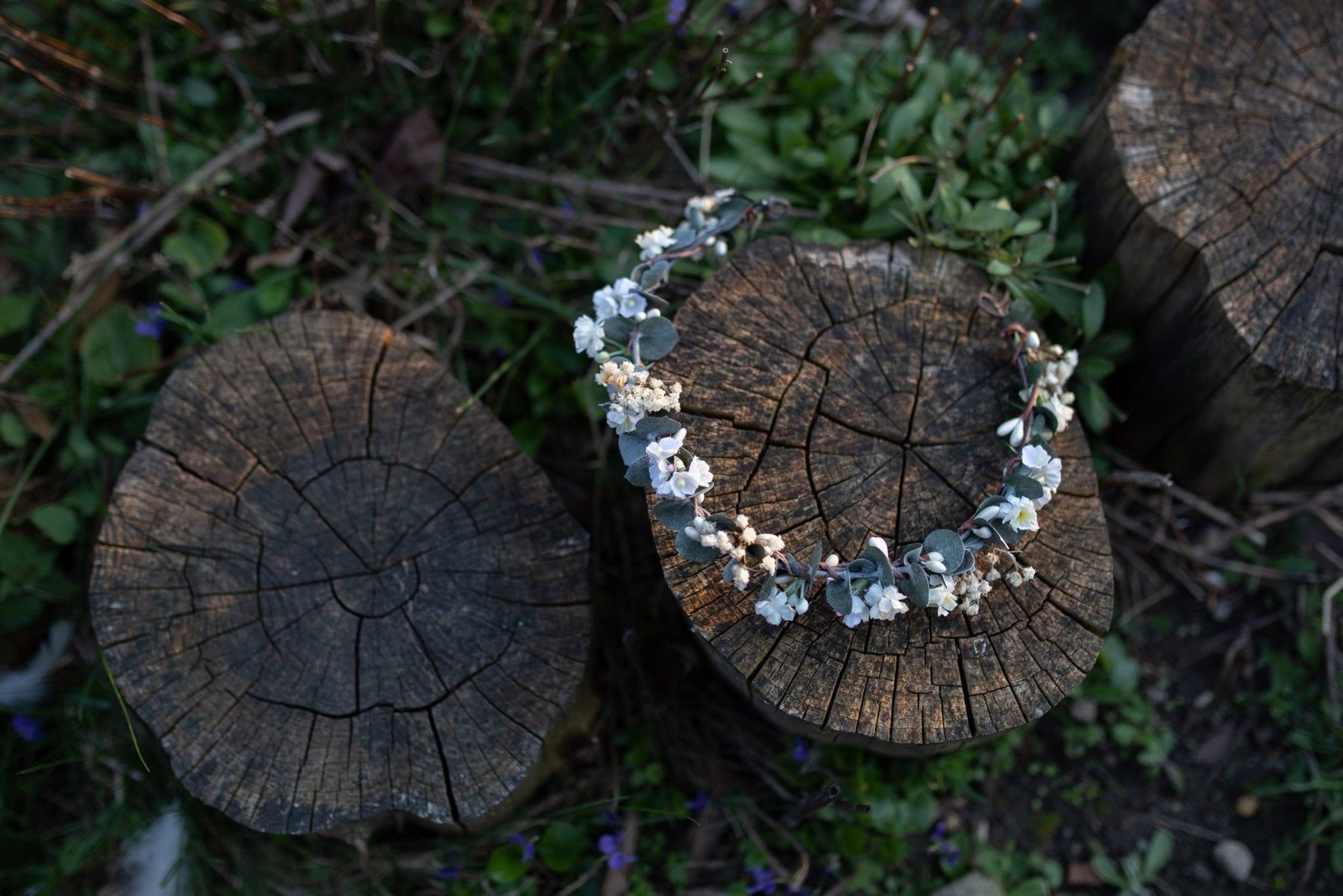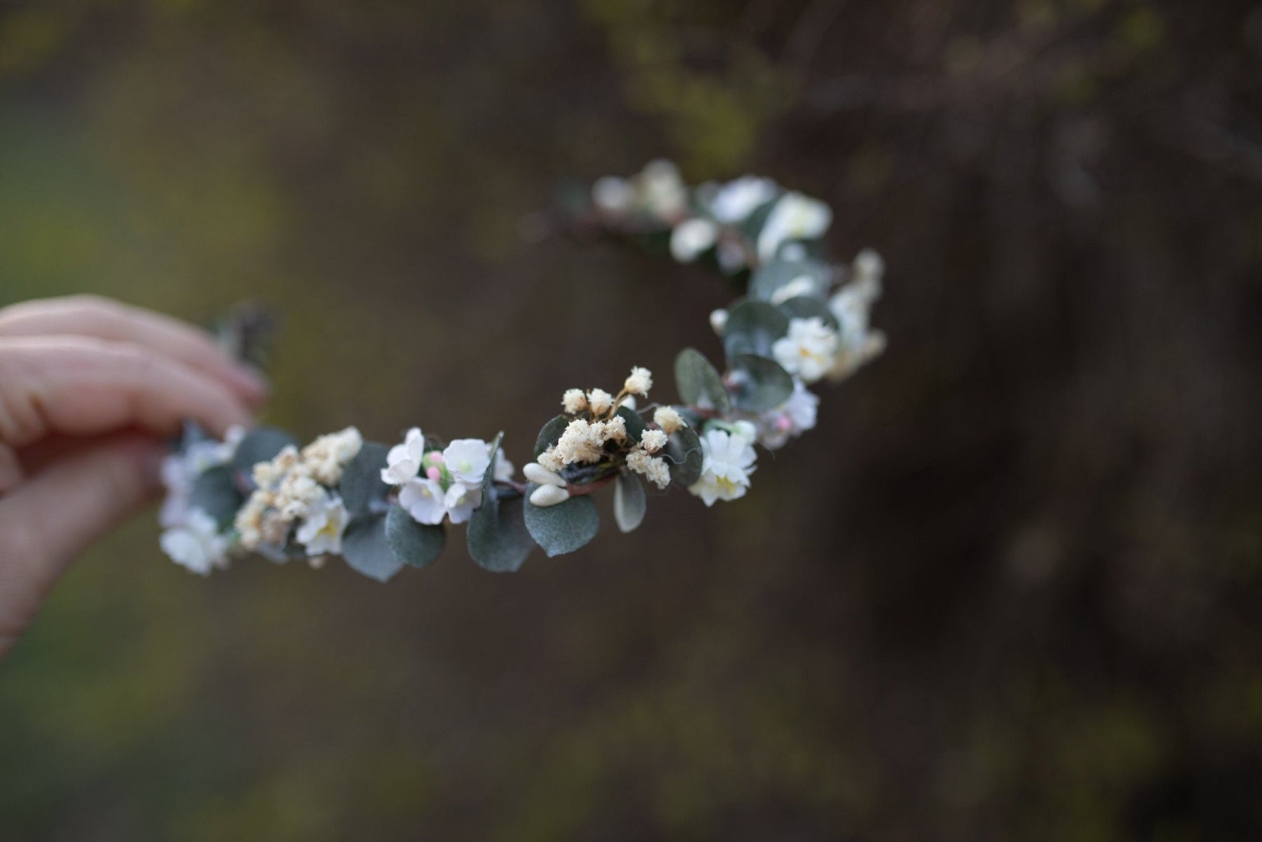 The hair crown is made of artificial flowers, preserved baby's breath, eucalyptus leaves, grass, wire and other floristic trinkets used for arranging.